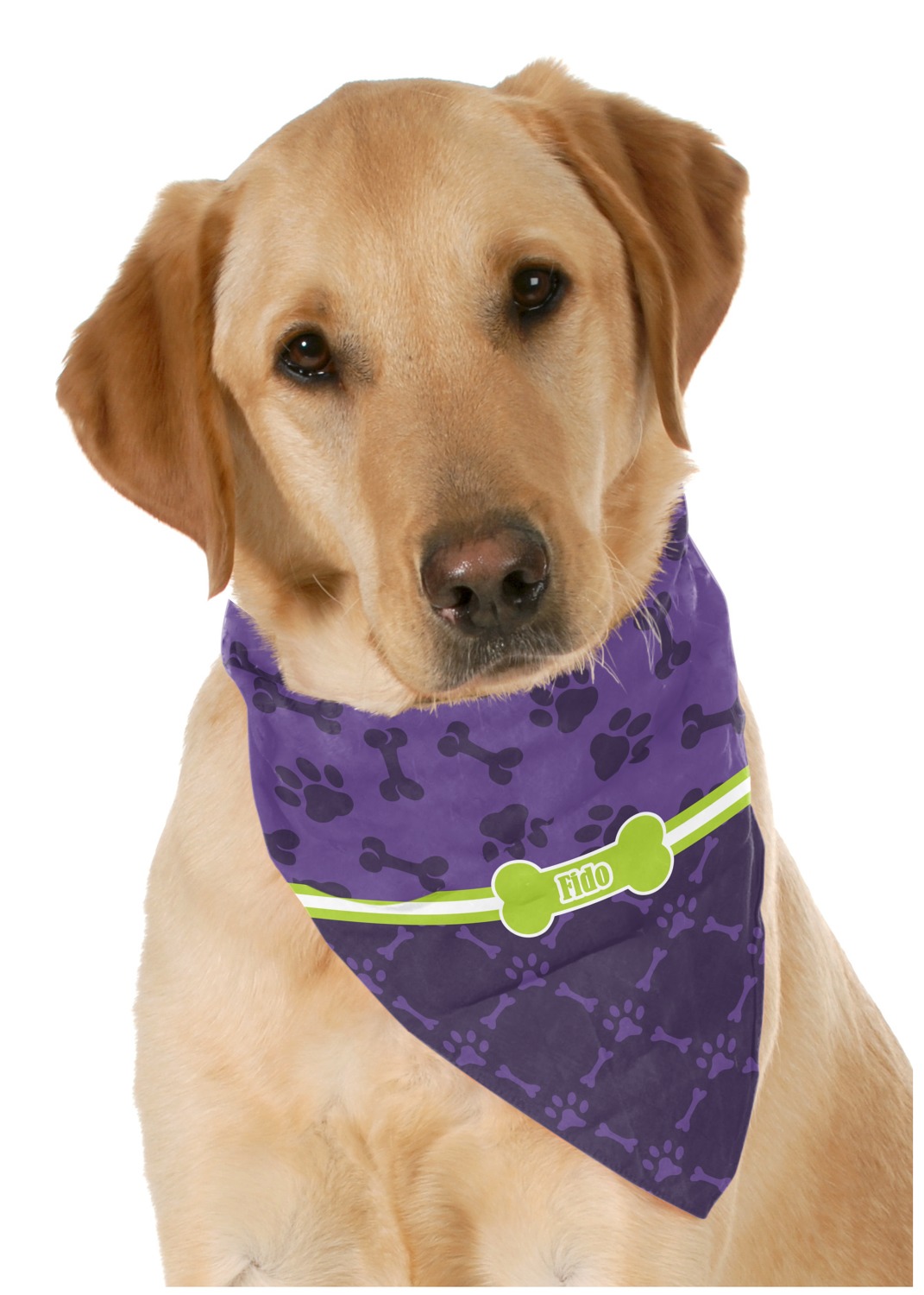 This beautiful pet bandana really is the perfect accessory. It is made from a silky feeling polyester and measures at approximately 23" x 23". Your personalization will be printed on a diagonal, so that you are able to read the personalization when folded into a triangle. This bandana fits best on large dogs, but can be folded smaller if there is no personalized text to fit smaller pets.
