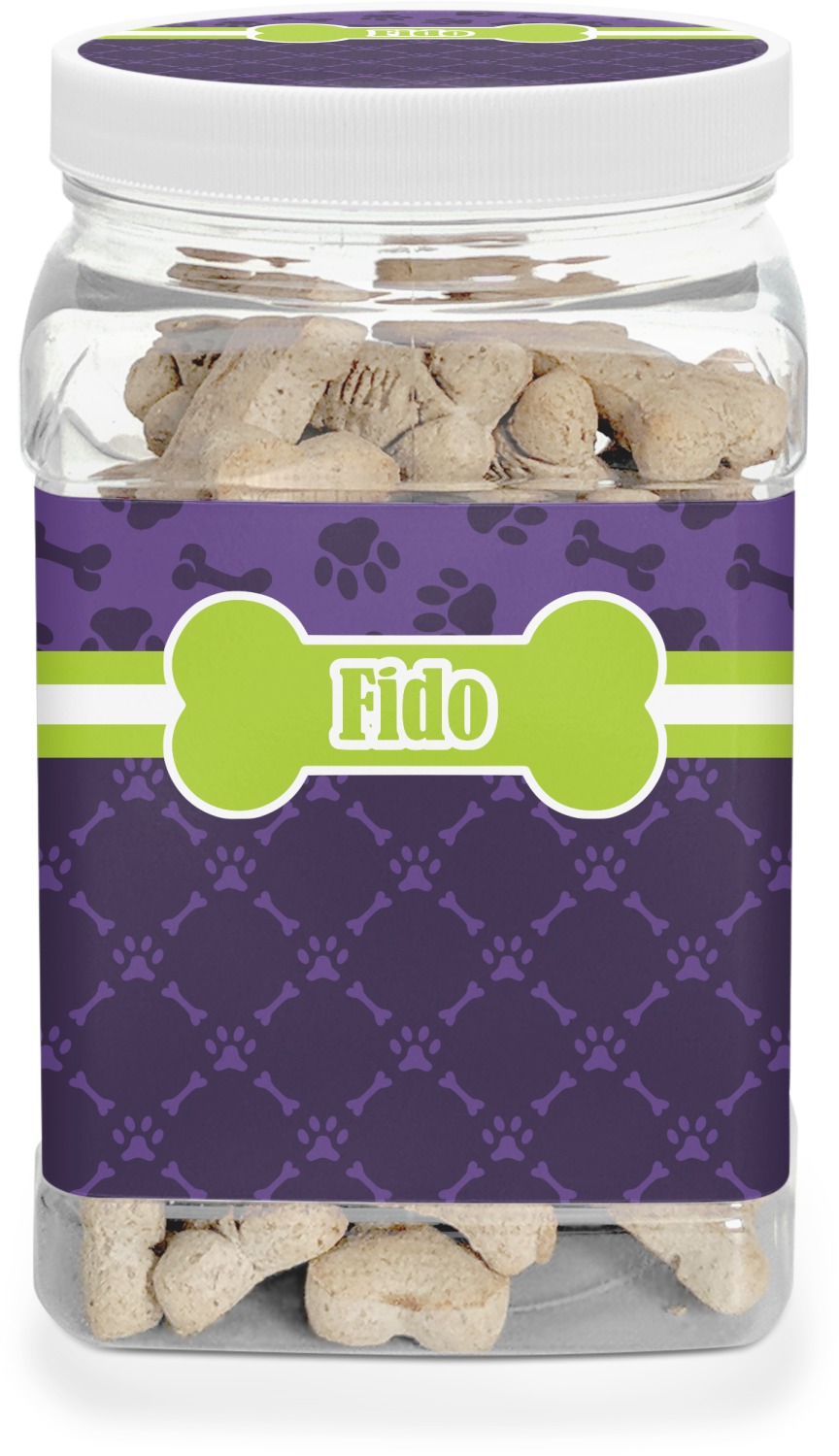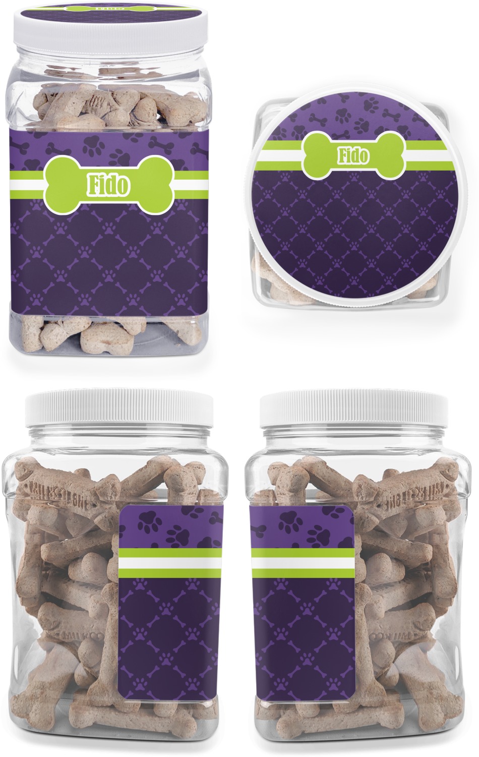 This half gallon jar, made from a sturdy plastic, is the perfect way to keep treats from any naughty pet paws, while still keeping them ready on hand for when your pup performs an impressive trick. This dog cookie jar features a screw-on, white lid that displays your personalized design on a vinyl sticker. We apply another customized sticker that wraps around the front and sides of the jar. Our dog treat jar also has indentations on the rear ends of the sides, which allows for convenient handling, and its square frame allows for easy storage.