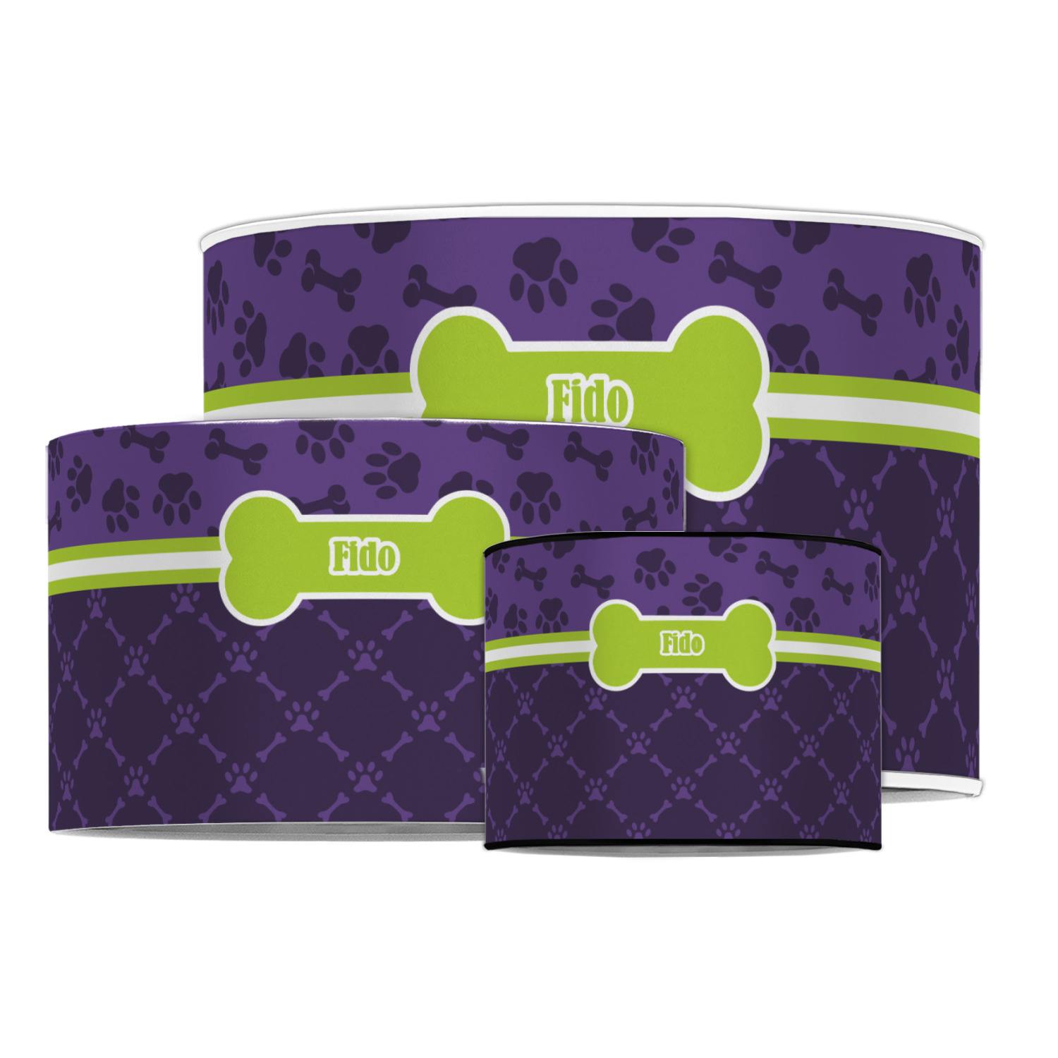 This design is a dark purple with light purple accents. It is divided into two different patterns that have bones and pawprints on them arranged in different ways. The dividing line, which is closer to the top, is made of a lime green and white ribbon. A label in the shape of a bone is on top with your pet's name right in the middle. The coordinating design has a fun sillhouette of a dog.