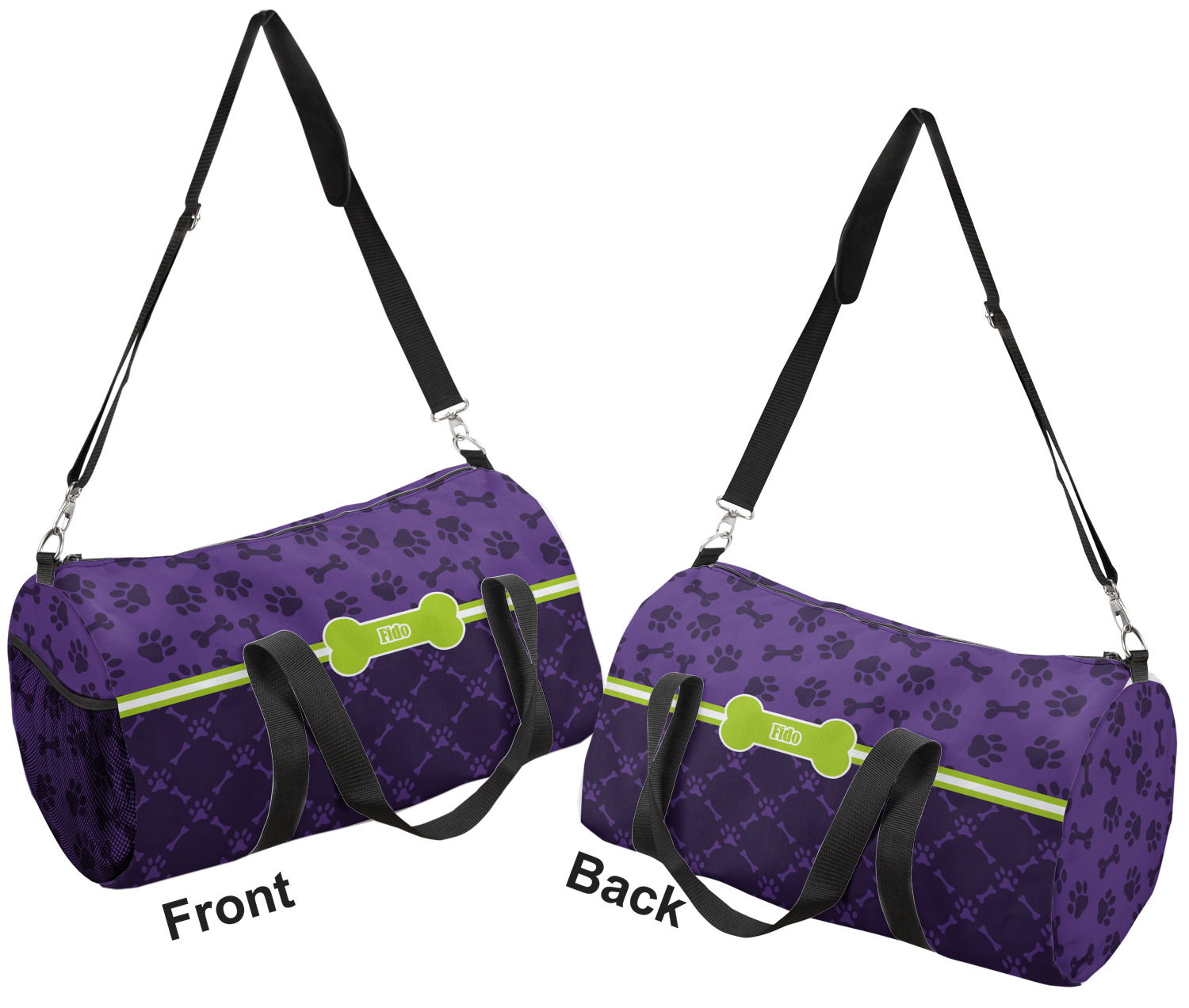 This duffle is a sturdy bag made of a canvas material. It comes in two sizes: Small (19"W x 9.5"H x 9.5"D) and Large (23"W x 12"H x 12"D). The bag is a cylindrical shape with a black adjustable strap and two handles. On one side is an elastic pouch to put a waterbottle or other small item. Your product will be sublimated with your design and is able to be designed on the front, back, and sides. Be sure to remember that the straps may cut into parts of your design if you upload your own artwork.