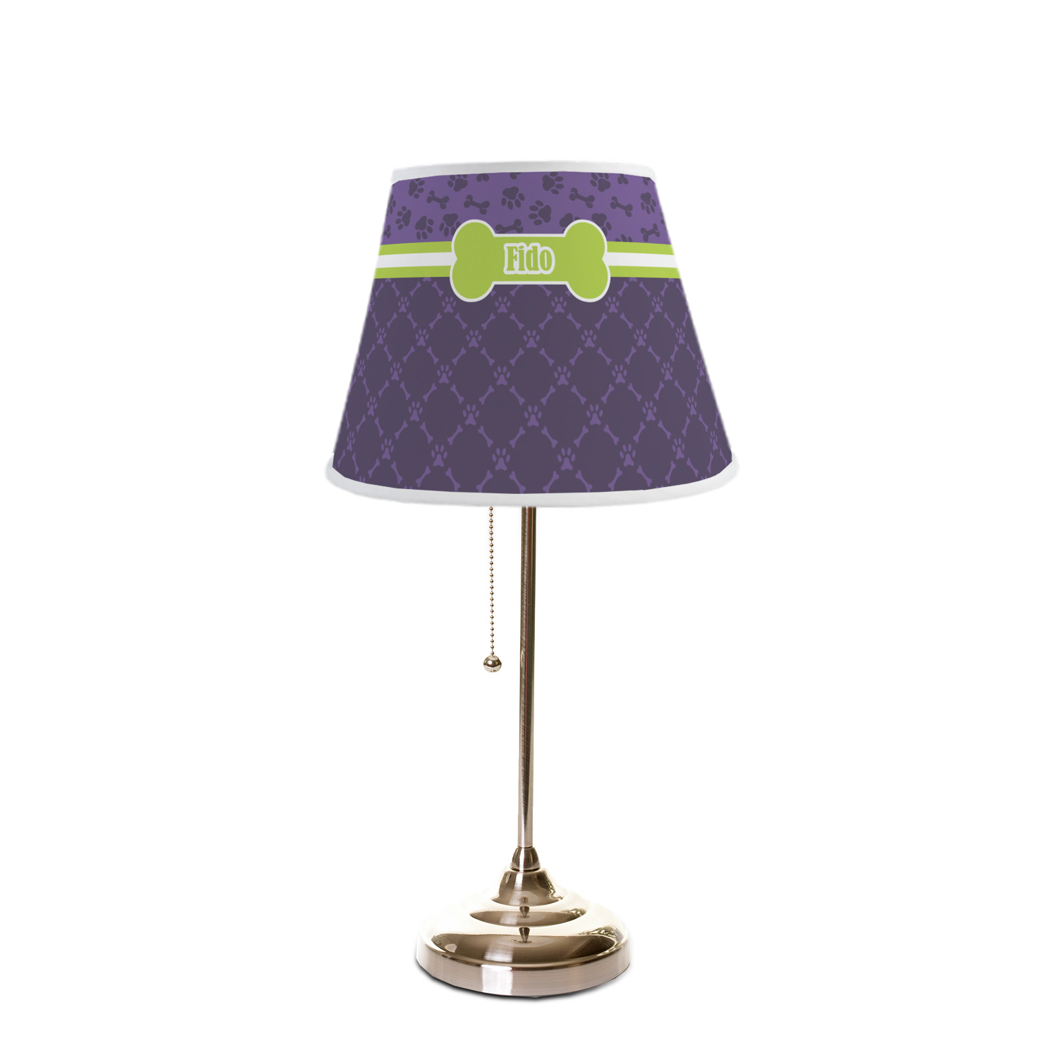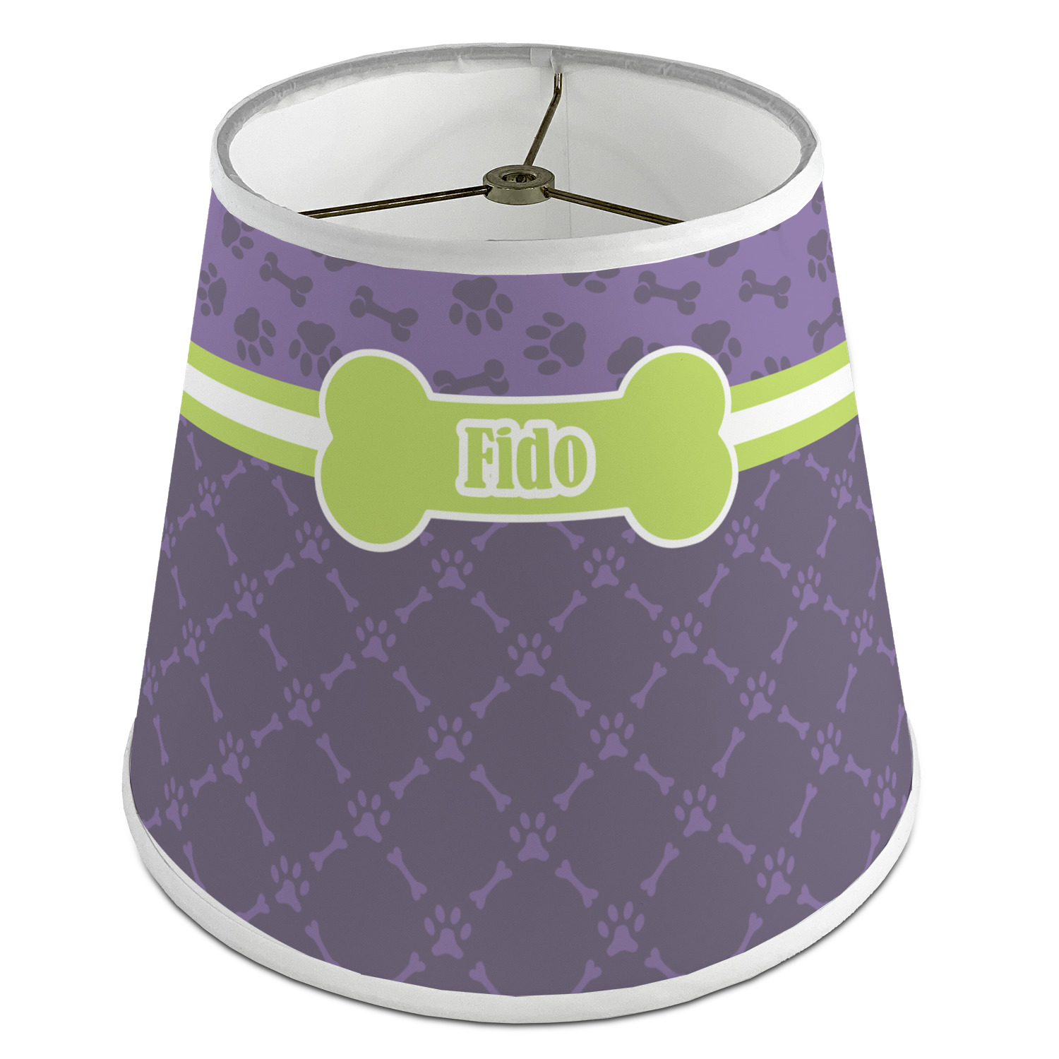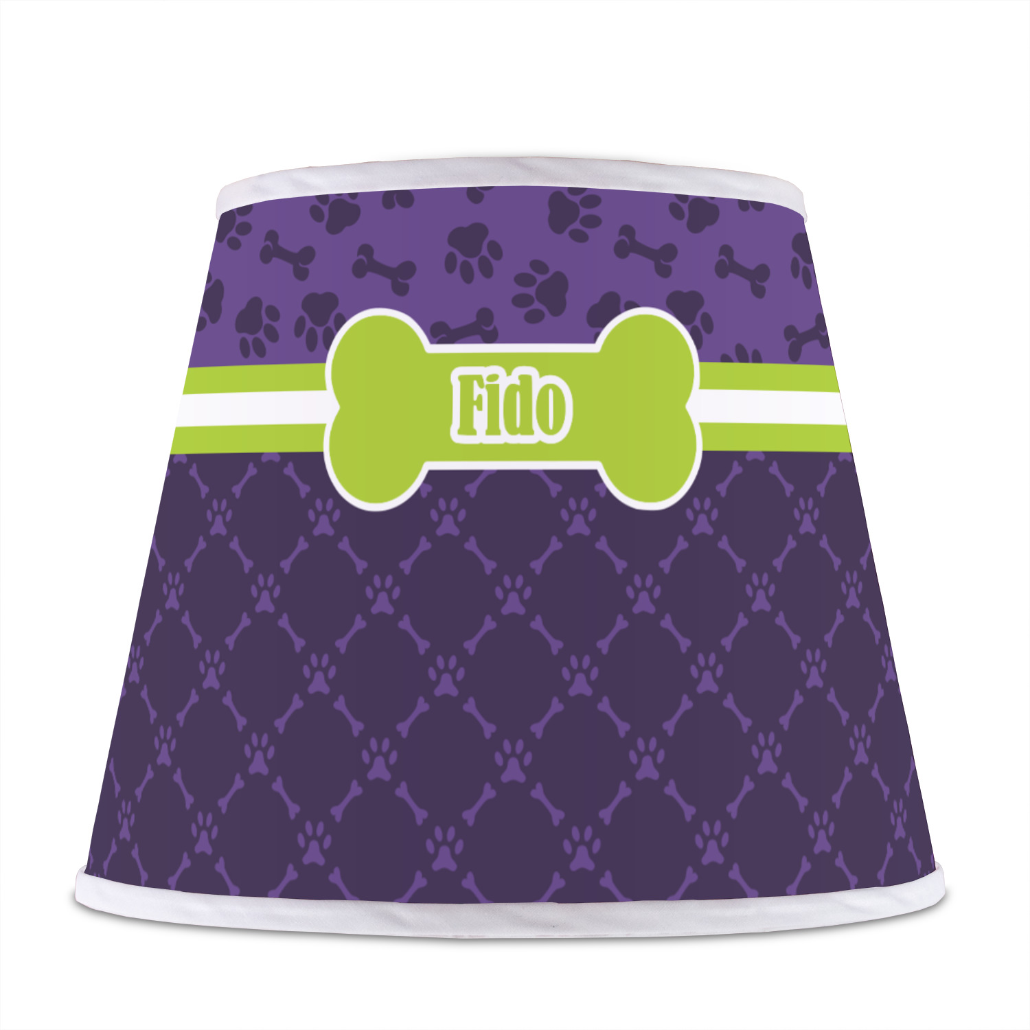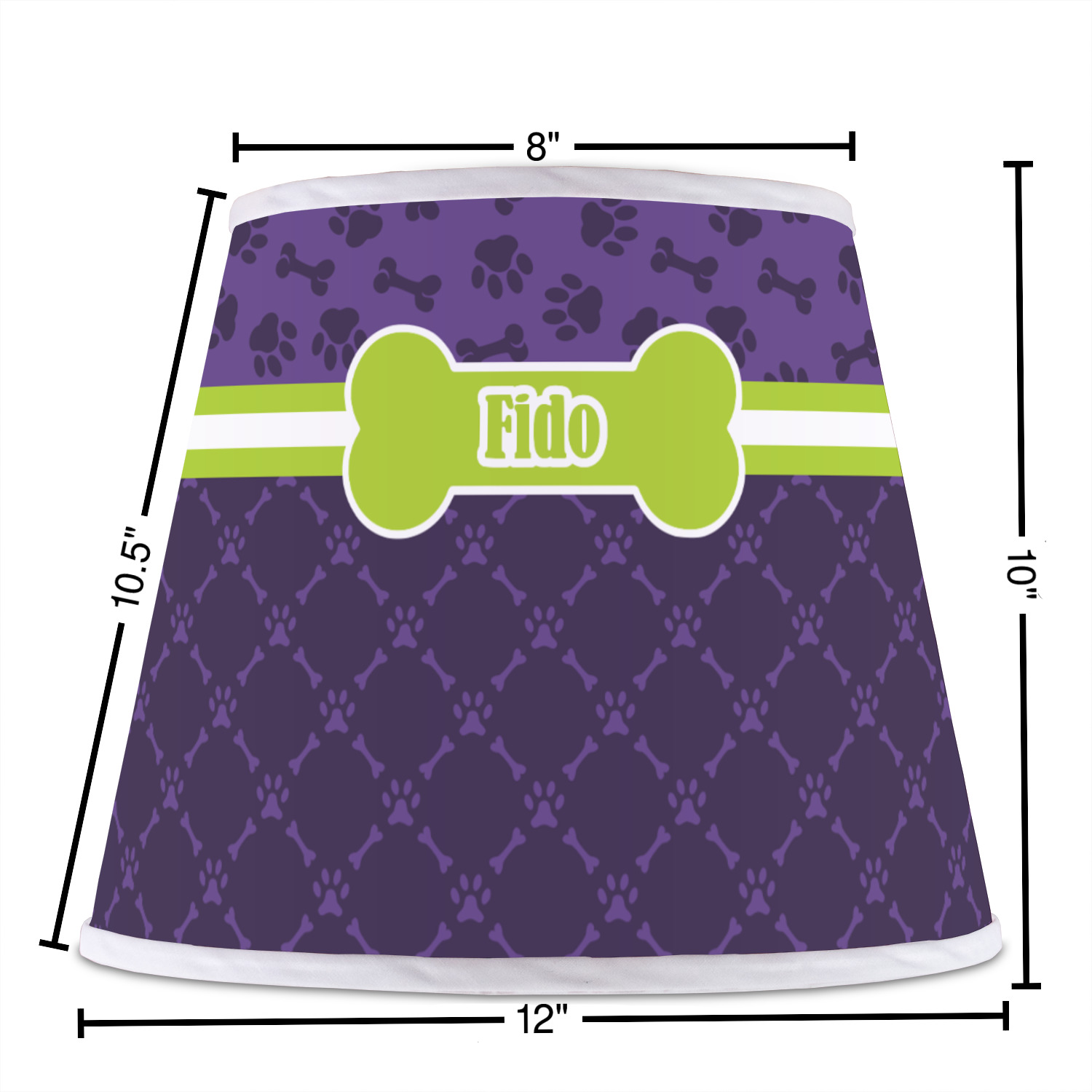 The base of this lampshade is 12 inches in diameter, and the top spans 8 inches in diameter. The total height of the lampshade is 10 inches. The angled nature of this custom lampshade concentrates the light, making it ideal for smaller spaces. This lampshade is made of matte, polyfilm, and displays your customization in its middle. The top and bottom of this colorful lamp shade are lined with a white fabric ribbon (which can be replaced with black inside the design studio) which frames your design and creates a sophisticated finish. As an UNO fitter lampshade, this unique lamp shade will fit a variety of bases.