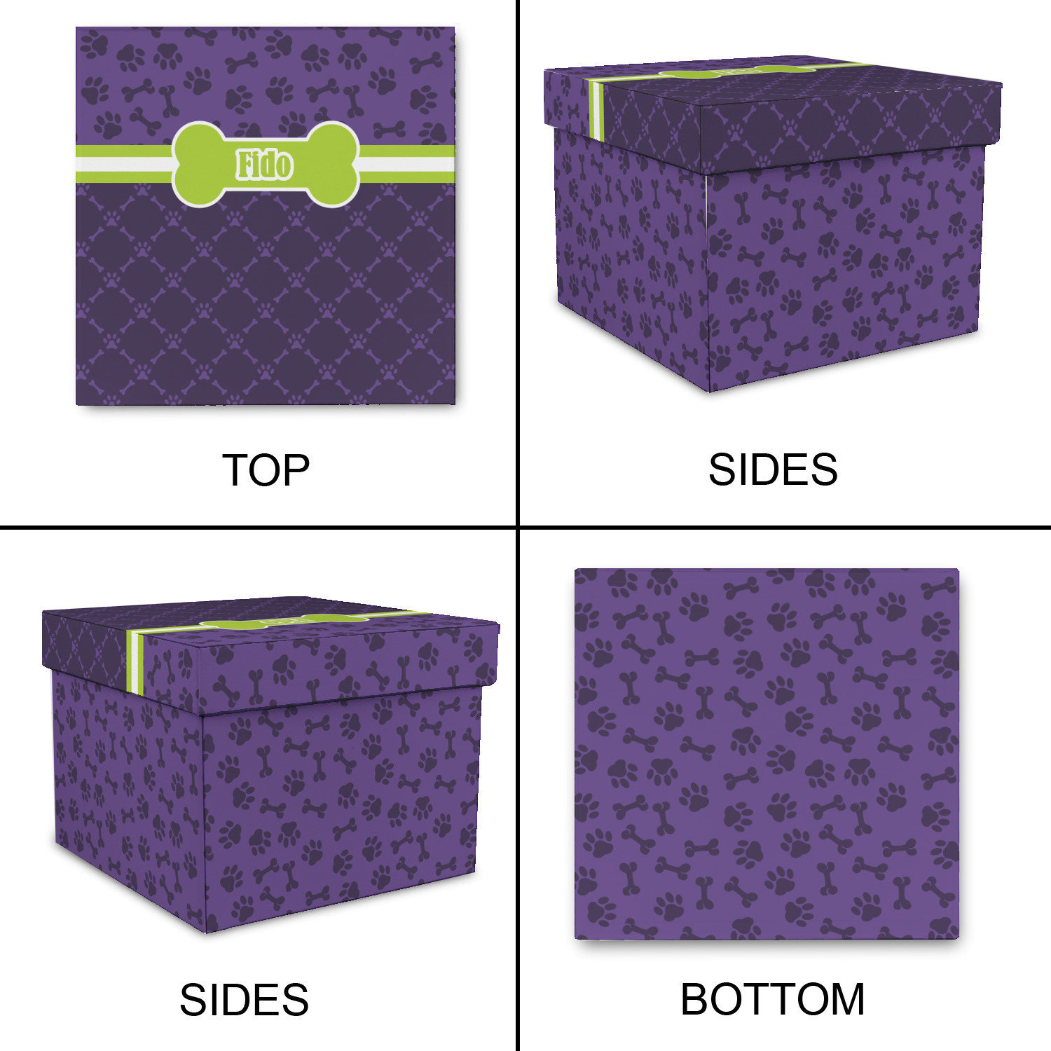 This design is a dark purple with light purple accents. It is divided into two different patterns that have bones and pawprints on them arranged in different ways. The dividing line, which is closer to the top, is made of a lime green and white ribbon. A label in the shape of a bone is on top with your pet's name right in the middle. The coordinating design has a fun sillhouette of a dog.