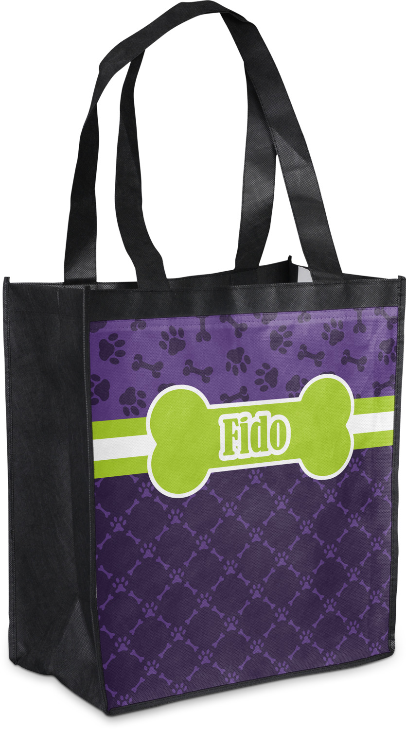 Made from a durable, biodegradable material, these reusable shopping bags can support up to 30 pounds of weight. With two large handles, measuring at 8.5 inches each, these personalized tote bags are easy to carry to your vehicle or home. The bag itself is 12 by 13.5 inches, and can expand to a depth of 7 inches. Your customization is printed on both the front and back, while the remaining sides, trim, and handle are a sleek, charcoal black.