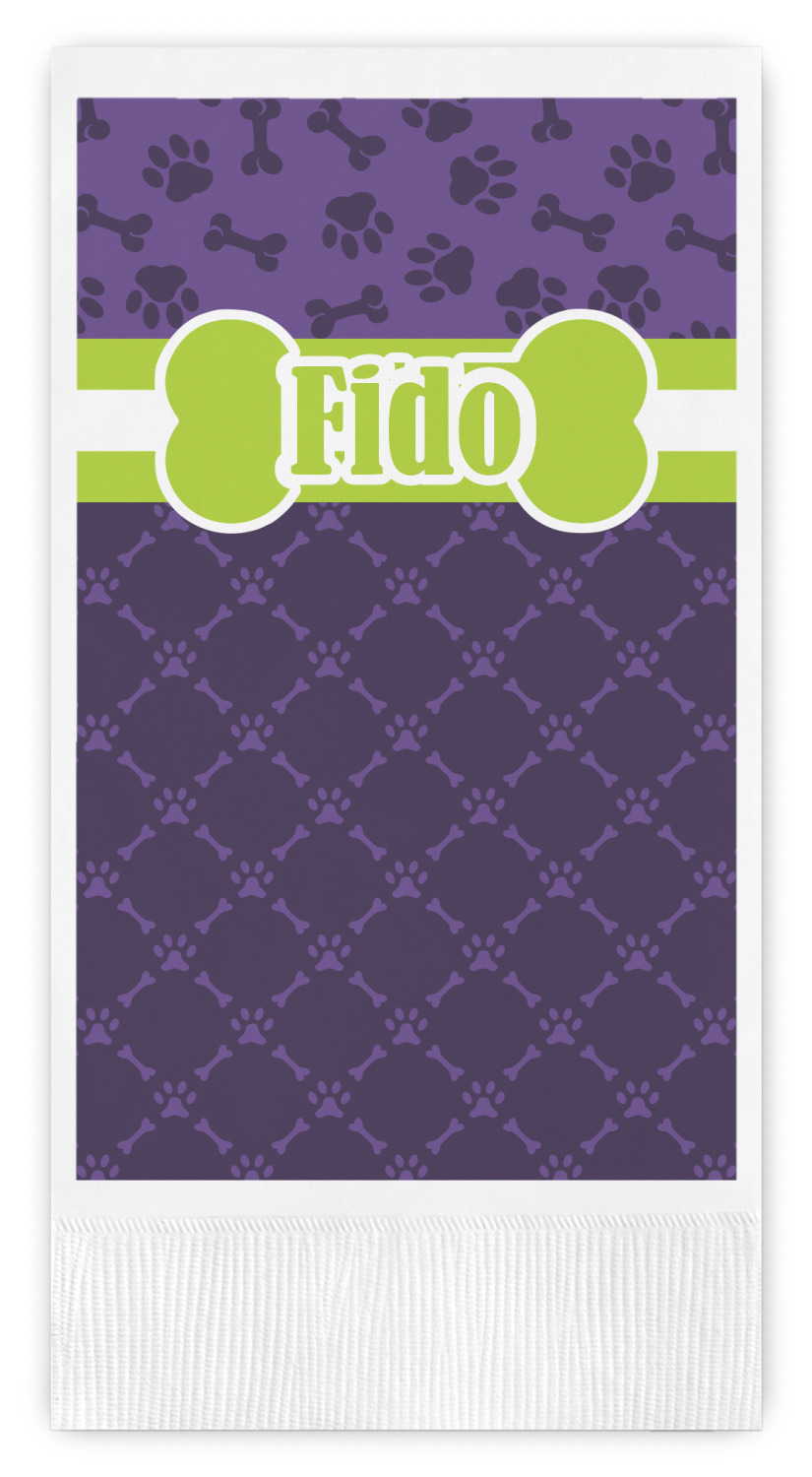 This design is a dark purple with light purple accents. It is divided into two different patterns that have bones and pawprints on them arranged in different ways. The dividing line, which is closer to the top, is made of a lime green and white ribbon. A label in the shape of a bone is on top with your pet's name right in the middle. The coordinating design has a fun sillhouette of a dog.