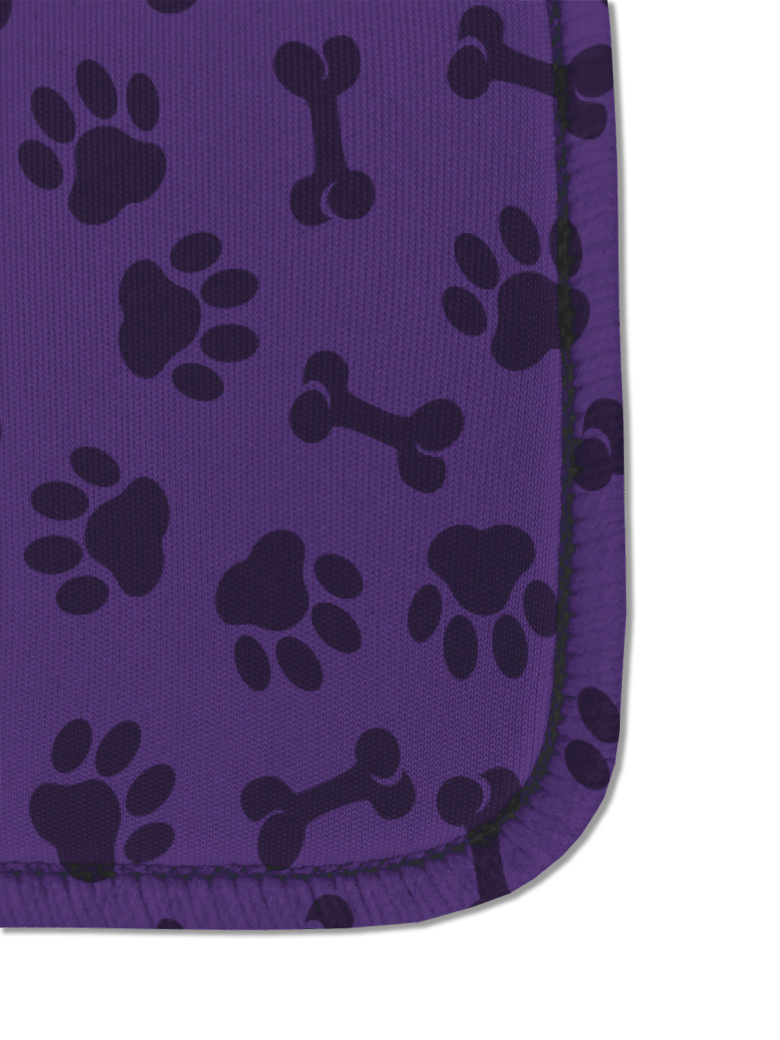This design is a dark purple with light purple accents. It is divided into two different patterns that have bones and pawprints on them arranged in different ways. The dividing line, which is closer to the top, is made of a lime green and white ribbon. A label in the shape of a bone is on top with your pet's name right in the middle. The coordinating design has a fun sillhouette of a dog.