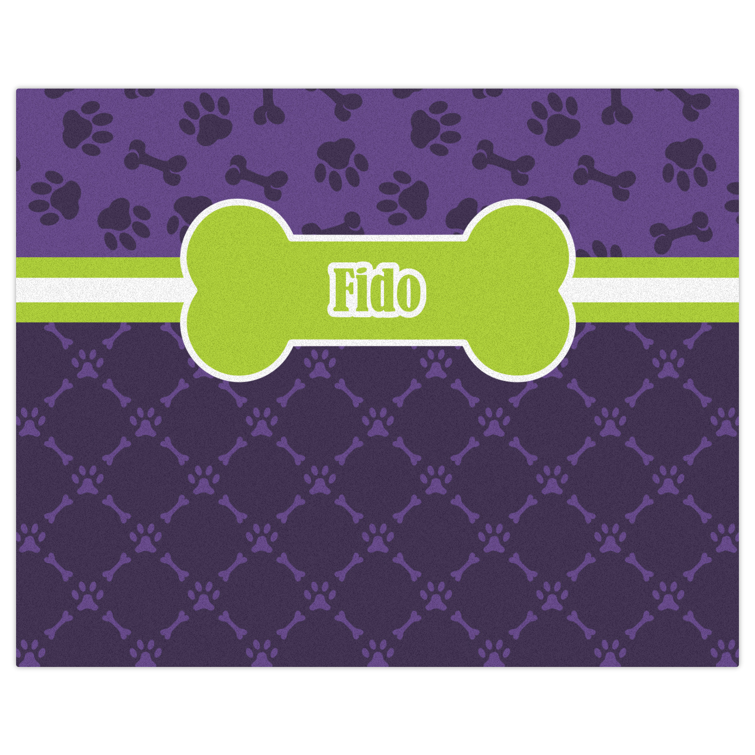 This design is a dark purple with light purple accents. It is divided into two different patterns that have bones and pawprints on them arranged in different ways. The dividing line, which is closer to the top, is made of a lime green and white ribbon. A label in the shape of a bone is on top with your pet's name right in the middle. The coordinating design has a fun sillhouette of a dog.