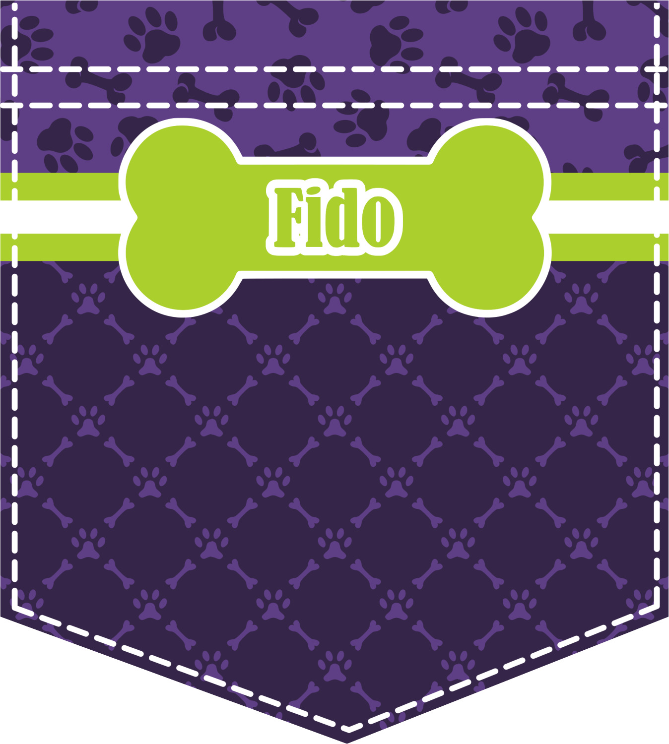 This design is a dark purple with light purple accents. It is divided into two different patterns that have bones and pawprints on them arranged in different ways. The dividing line, which is closer to the top, is made of a lime green and white ribbon. A label in the shape of a bone is on top with your pet's name right in the middle. The coordinating design has a fun sillhouette of a dog.