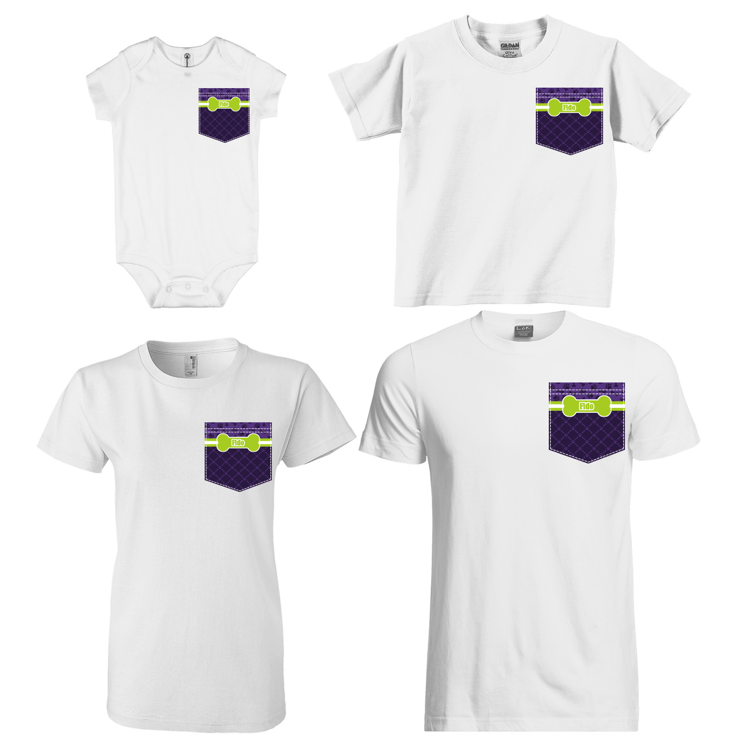 The faux pockets are available in 4 different sizes - for baby, kids, youth/women & men; the whole family can have the same pocket design, but sized just for them! The pockets are printed using our direct-to-film technology to the exact shape & size. We have faux stitching around the pocket, with double stitching on the top of the pocket to give it the authentic pocket look!