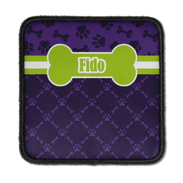 This design is a dark purple with light purple accents. It is divided into two different patterns that have bones and pawprints on them arranged in different ways. The dividing line, which is closer to the top, is made of a lime green and white ribbon. A label in the shape of a bone is on top with your pet's name right in the middle. The coordinating design has a fun sillhouette of a dog.