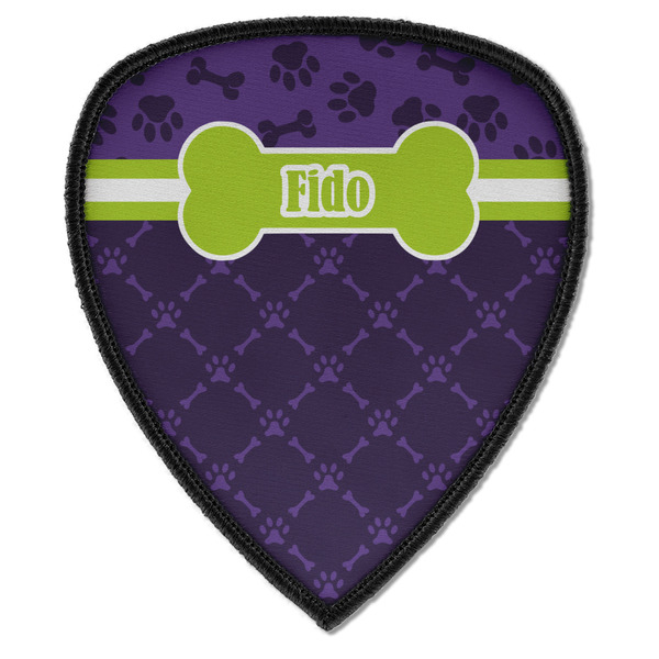 This design is a dark purple with light purple accents. It is divided into two different patterns that have bones and pawprints on them arranged in different ways. The dividing line, which is closer to the top, is made of a lime green and white ribbon. A label in the shape of a bone is on top with your pet's name right in the middle. The coordinating design has a fun sillhouette of a dog.