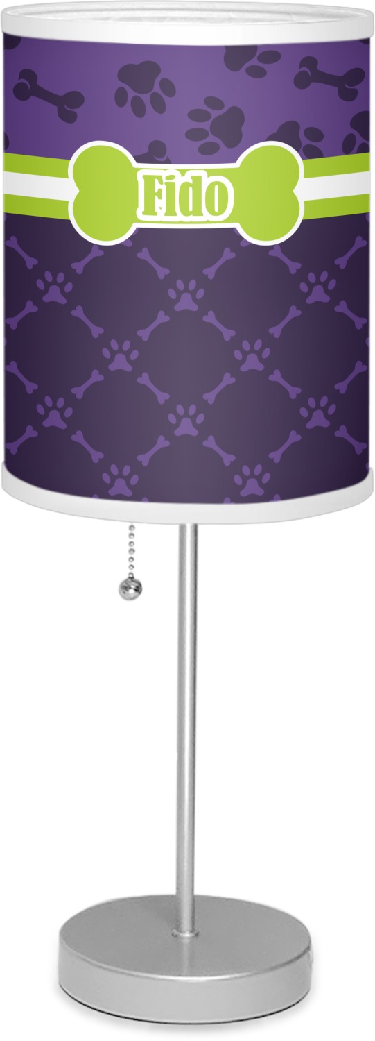 This design is a dark purple with light purple accents. It is divided into two different patterns that have bones and pawprints on them arranged in different ways. The dividing line, which is closer to the top, is made of a lime green and white ribbon. A label in the shape of a bone is on top with your pet's name right in the middle. The coordinating design has a fun sillhouette of a dog.