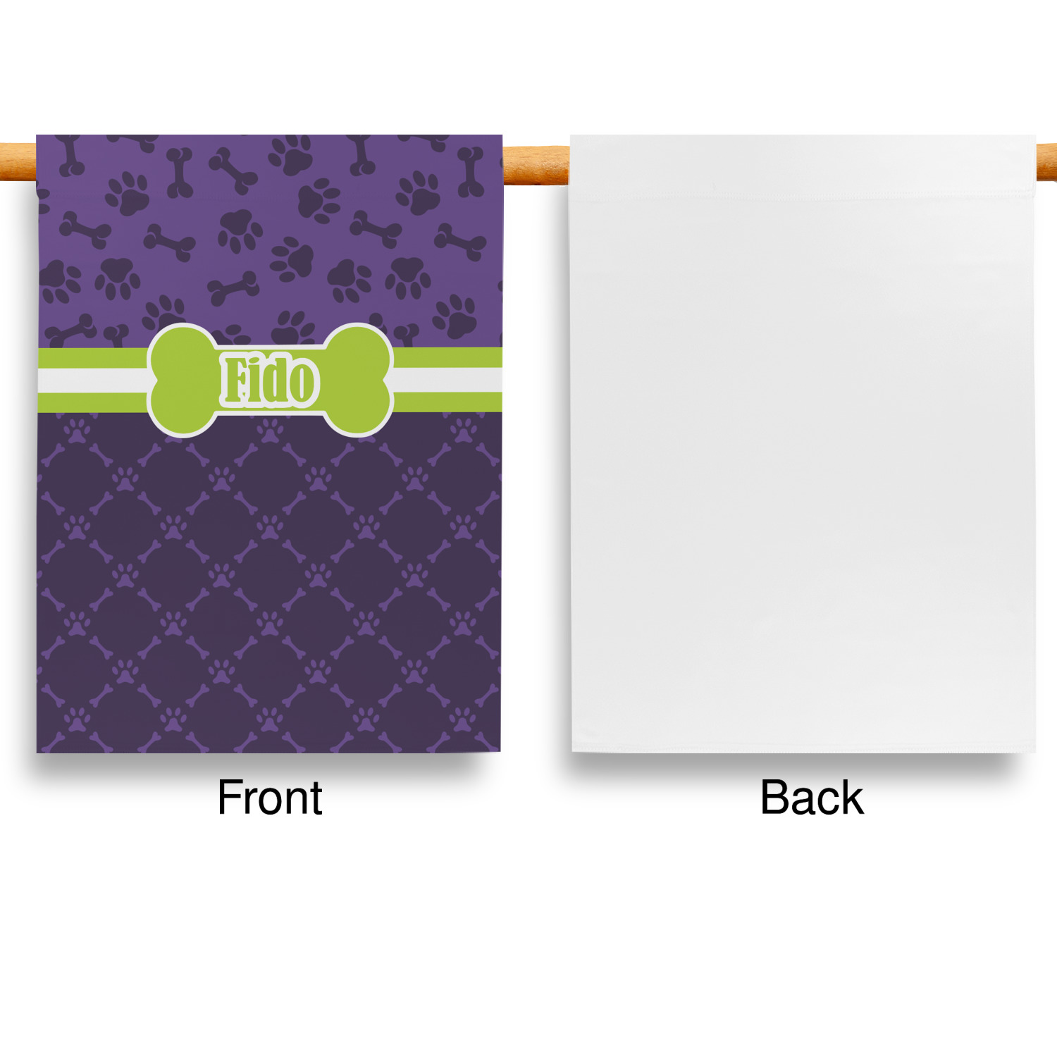 These custom garden flags are made of a durable, double-ply, polyester weave, allowing them to withstand the elements year round. The small flags measure at approximately 12 by 18 inches. The large flags measure out to 28 by 37 inches. You can order these decorative flags with your customization printed on the front only, or the front and back.