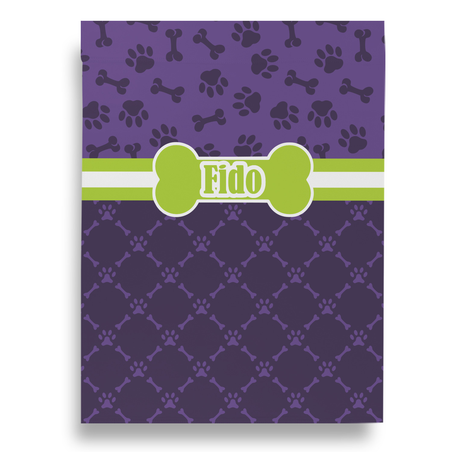 This design is a dark purple with light purple accents. It is divided into two different patterns that have bones and pawprints on them arranged in different ways. The dividing line, which is closer to the top, is made of a lime green and white ribbon. A label in the shape of a bone is on top with your pet's name right in the middle. The coordinating design has a fun sillhouette of a dog.