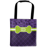 This design is a dark purple with light purple accents. It is divided into two different patterns that have bones and pawprints on them arranged in different ways. The dividing line, which is closer to the top, is made of a lime green and white ribbon. A label in the shape of a bone is on top with your pet's name right in the middle. The coordinating design has a fun sillhouette of a dog.