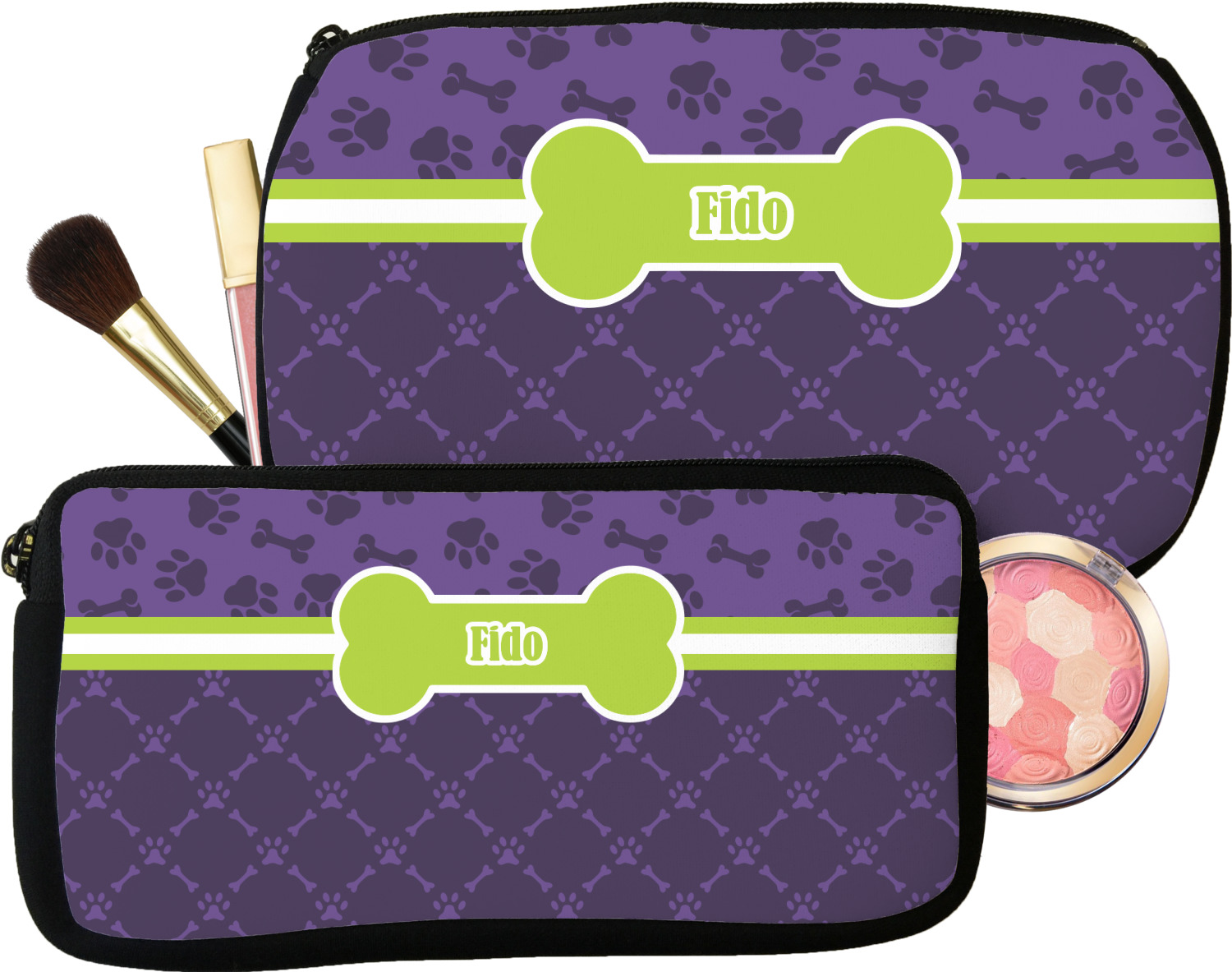 Our personalized makeup bags are available in many different designs, patterns and colors - so you are sure to find one that will love. They are made of neoprene (same material as wet-suits) and thus are water resistant, so spillages in your makeup bag will not end up all over you purse. They are customized on one side and are black on the other side and the zipper is black as well.