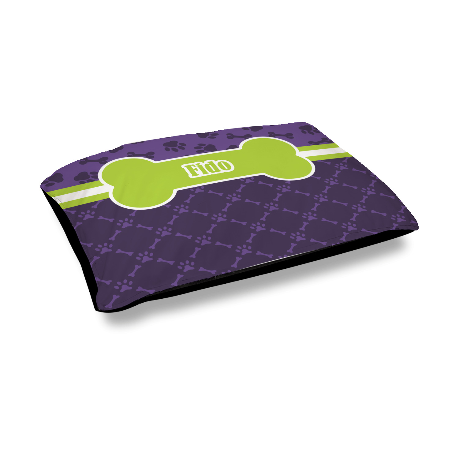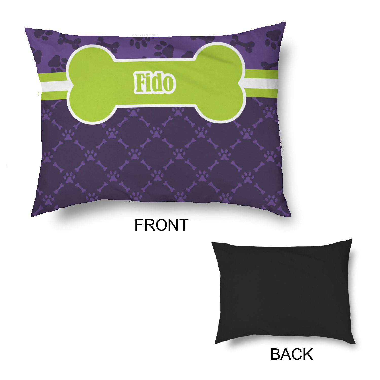 This design is a dark purple with light purple accents. It is divided into two different patterns that have bones and pawprints on them arranged in different ways. The dividing line, which is closer to the top, is made of a lime green and white ribbon. A label in the shape of a bone is on top with your pet's name right in the middle. The coordinating design has a fun sillhouette of a dog.