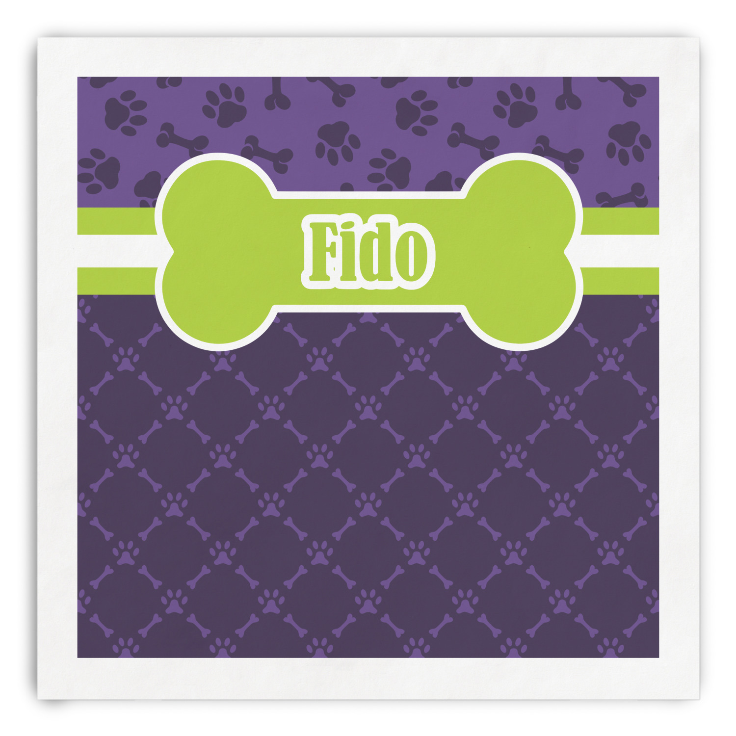This design is a dark purple with light purple accents. It is divided into two different patterns that have bones and pawprints on them arranged in different ways. The dividing line, which is closer to the top, is made of a lime green and white ribbon. A label in the shape of a bone is on top with your pet's name right in the middle. The coordinating design has a fun sillhouette of a dog.