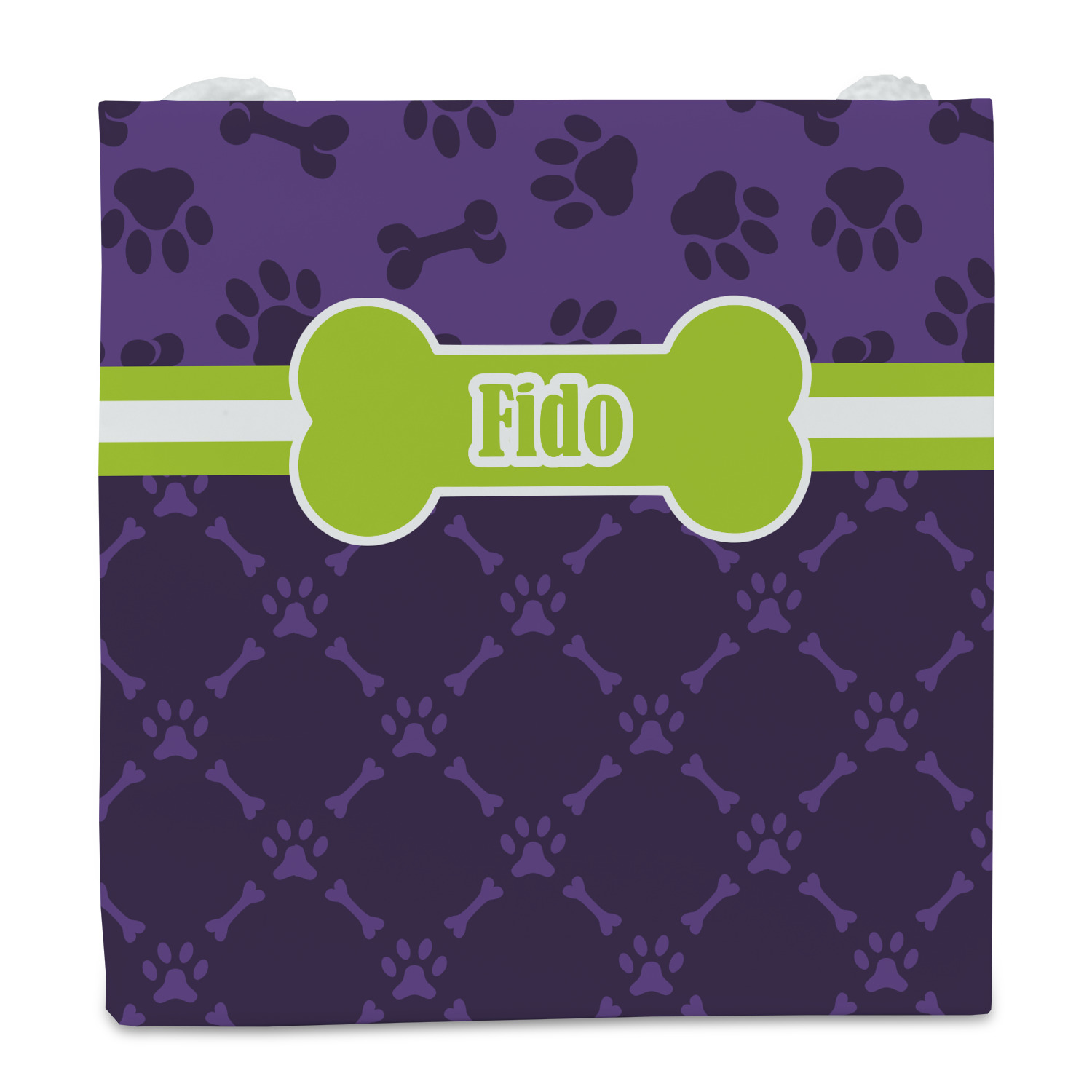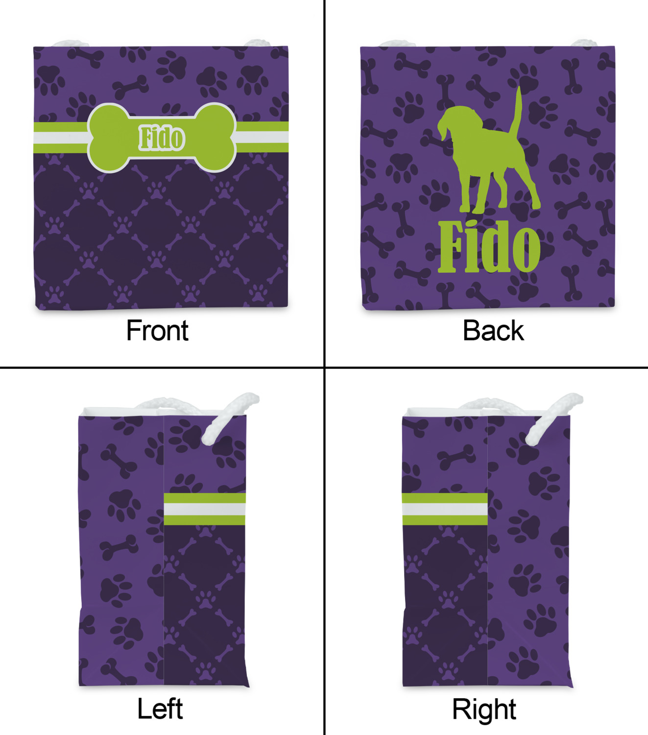 This design is a dark purple with light purple accents. It is divided into two different patterns that have bones and pawprints on them arranged in different ways. The dividing line, which is closer to the top, is made of a lime green and white ribbon. A label in the shape of a bone is on top with your pet's name right in the middle. The coordinating design has a fun sillhouette of a dog.
