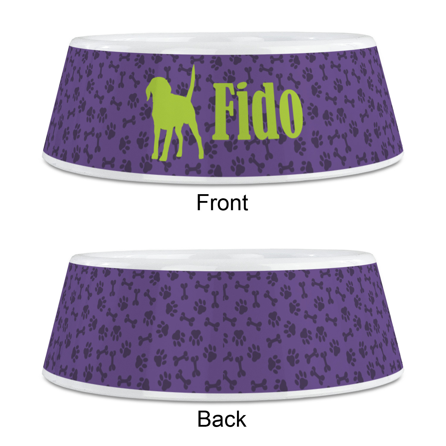 This design is a dark purple with light purple accents. It is divided into two different patterns that have bones and pawprints on them arranged in different ways. The dividing line, which is closer to the top, is made of a lime green and white ribbon. A label in the shape of a bone is on top with your pet's name right in the middle. The coordinating design has a fun sillhouette of a dog.