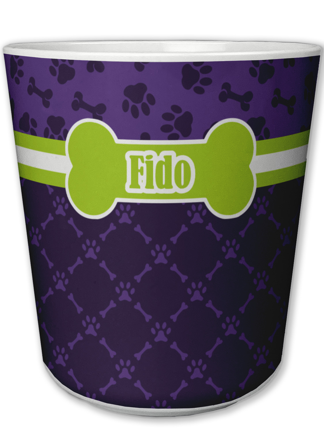 This design is a dark purple with light purple accents. It is divided into two different patterns that have bones and pawprints on them arranged in different ways. The dividing line, which is closer to the top, is made of a lime green and white ribbon. A label in the shape of a bone is on top with your pet's name right in the middle. The coordinating design has a fun sillhouette of a dog.