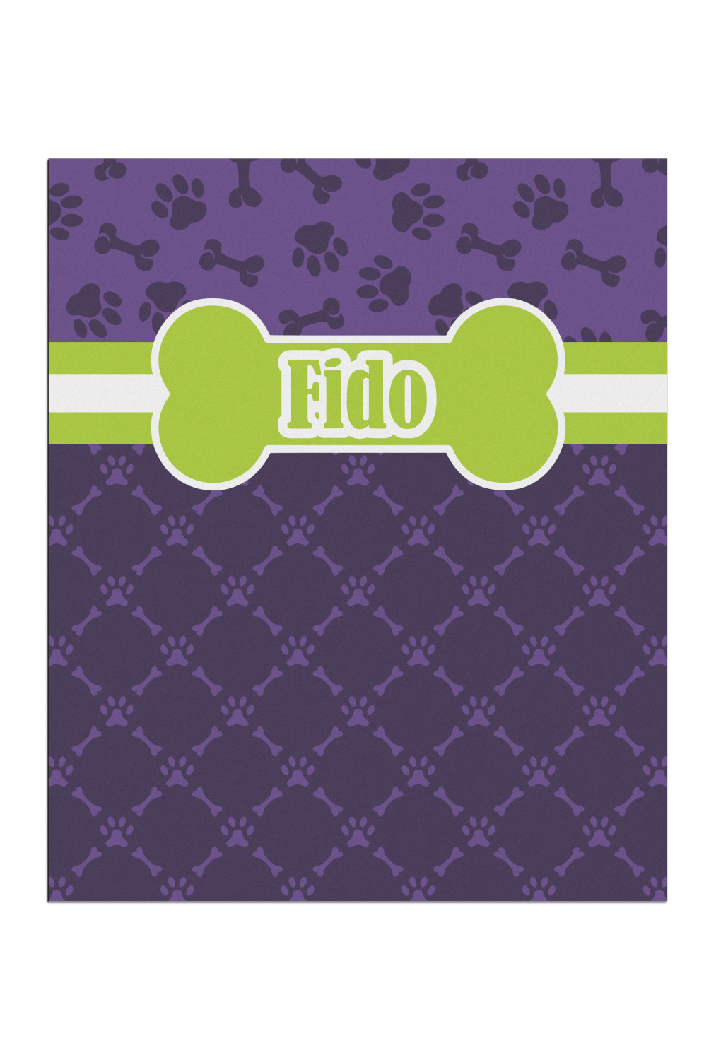 This design is a dark purple with light purple accents. It is divided into two different patterns that have bones and pawprints on them arranged in different ways. The dividing line, which is closer to the top, is made of a lime green and white ribbon. A label in the shape of a bone is on top with your pet's name right in the middle. The coordinating design has a fun sillhouette of a dog.