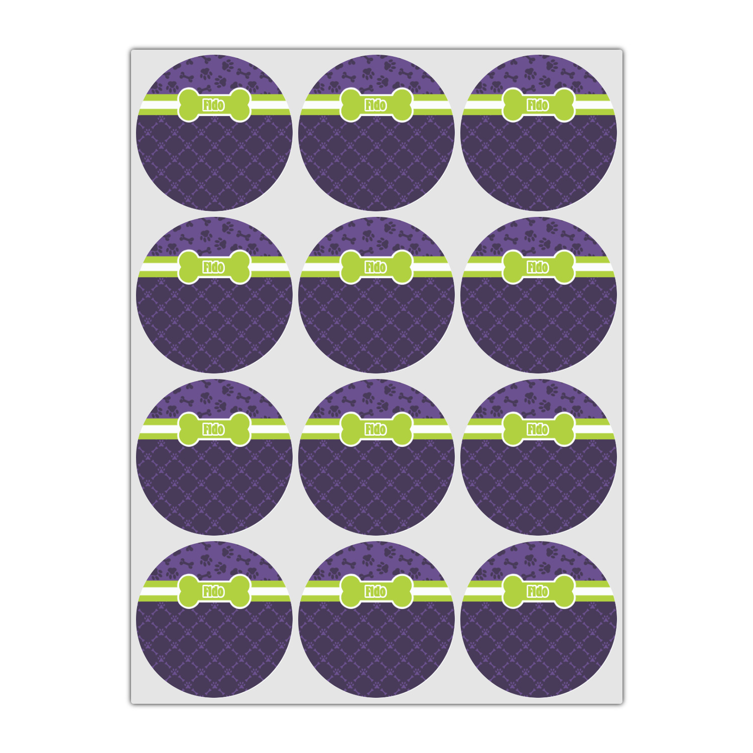 This design is a dark purple with light purple accents. It is divided into two different patterns that have bones and pawprints on them arranged in different ways. The dividing line, which is closer to the top, is made of a lime green and white ribbon. A label in the shape of a bone is on top with your pet's name right in the middle. The coordinating design has a fun sillhouette of a dog.