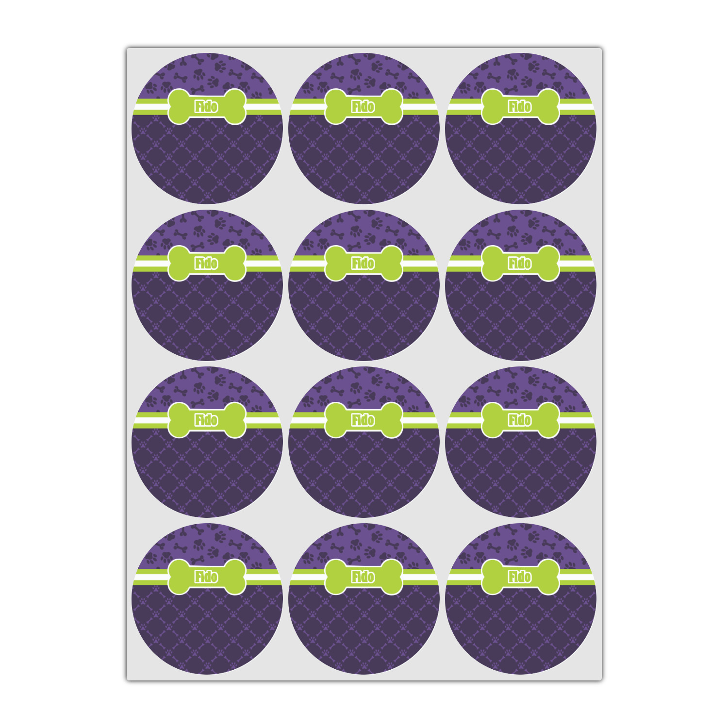 This design is a dark purple with light purple accents. It is divided into two different patterns that have bones and pawprints on them arranged in different ways. The dividing line, which is closer to the top, is made of a lime green and white ribbon. A label in the shape of a bone is on top with your pet's name right in the middle. The coordinating design has a fun sillhouette of a dog.