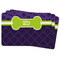 This design is a dark purple with light purple accents. It is divided into two different patterns that have bones and pawprints on them arranged in different ways. The dividing line, which is closer to the top, is made of a lime green and white ribbon. A label in the shape of a bone is on top with your pet's name right in the middle. The coordinating design has a fun sillhouette of a dog.