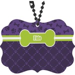 This design is a dark purple with light purple accents. It is divided into two different patterns that have bones and pawprints on them arranged in different ways. The dividing line, which is closer to the top, is made of a lime green and white ribbon. A label in the shape of a bone is on top with your pet's name right in the middle. The coordinating design has a fun sillhouette of a dog.