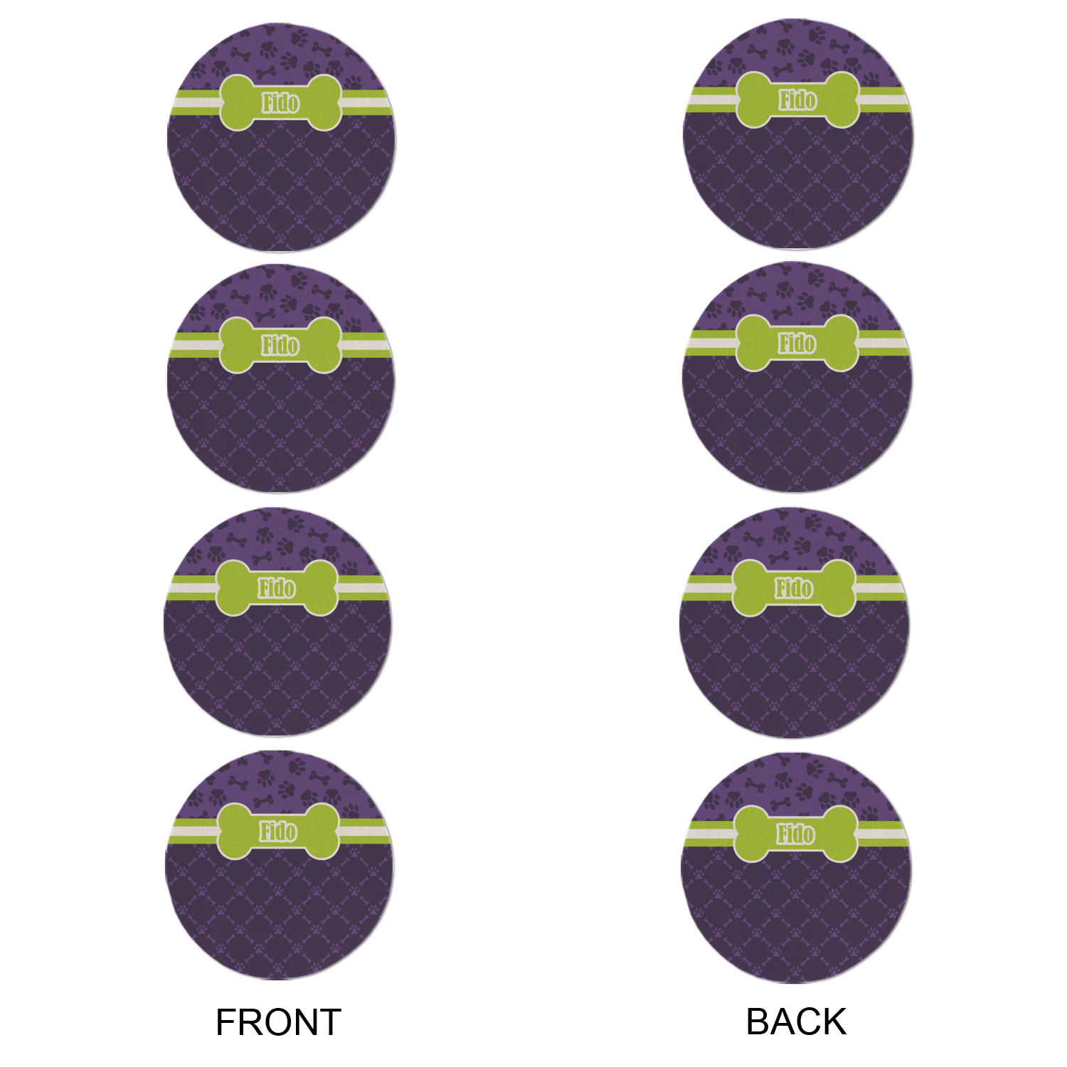 This design is a dark purple with light purple accents. It is divided into two different patterns that have bones and pawprints on them arranged in different ways. The dividing line, which is closer to the top, is made of a lime green and white ribbon. A label in the shape of a bone is on top with your pet's name right in the middle. The coordinating design has a fun sillhouette of a dog.