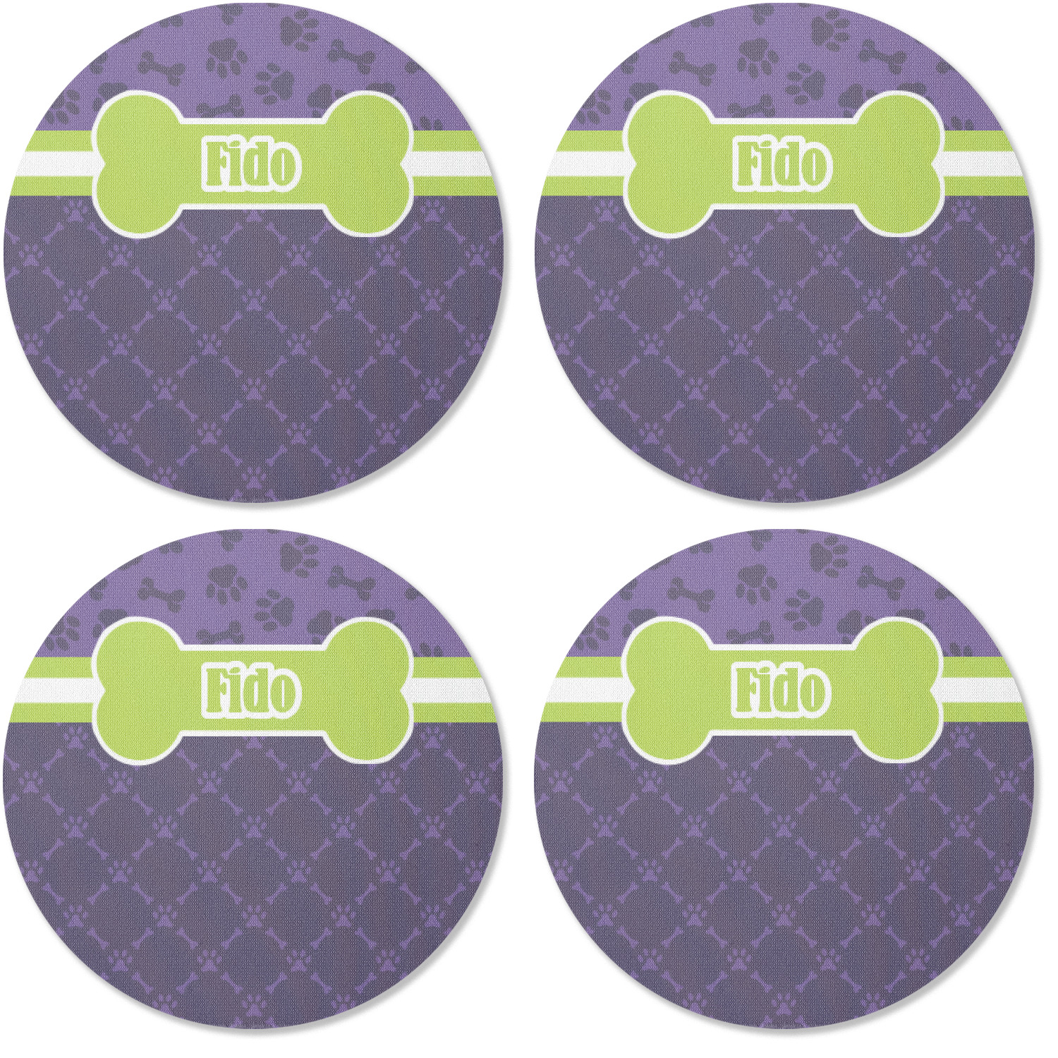 This design is a dark purple with light purple accents. It is divided into two different patterns that have bones and pawprints on them arranged in different ways. The dividing line, which is closer to the top, is made of a lime green and white ribbon. A label in the shape of a bone is on top with your pet's name right in the middle. The coordinating design has a fun sillhouette of a dog.