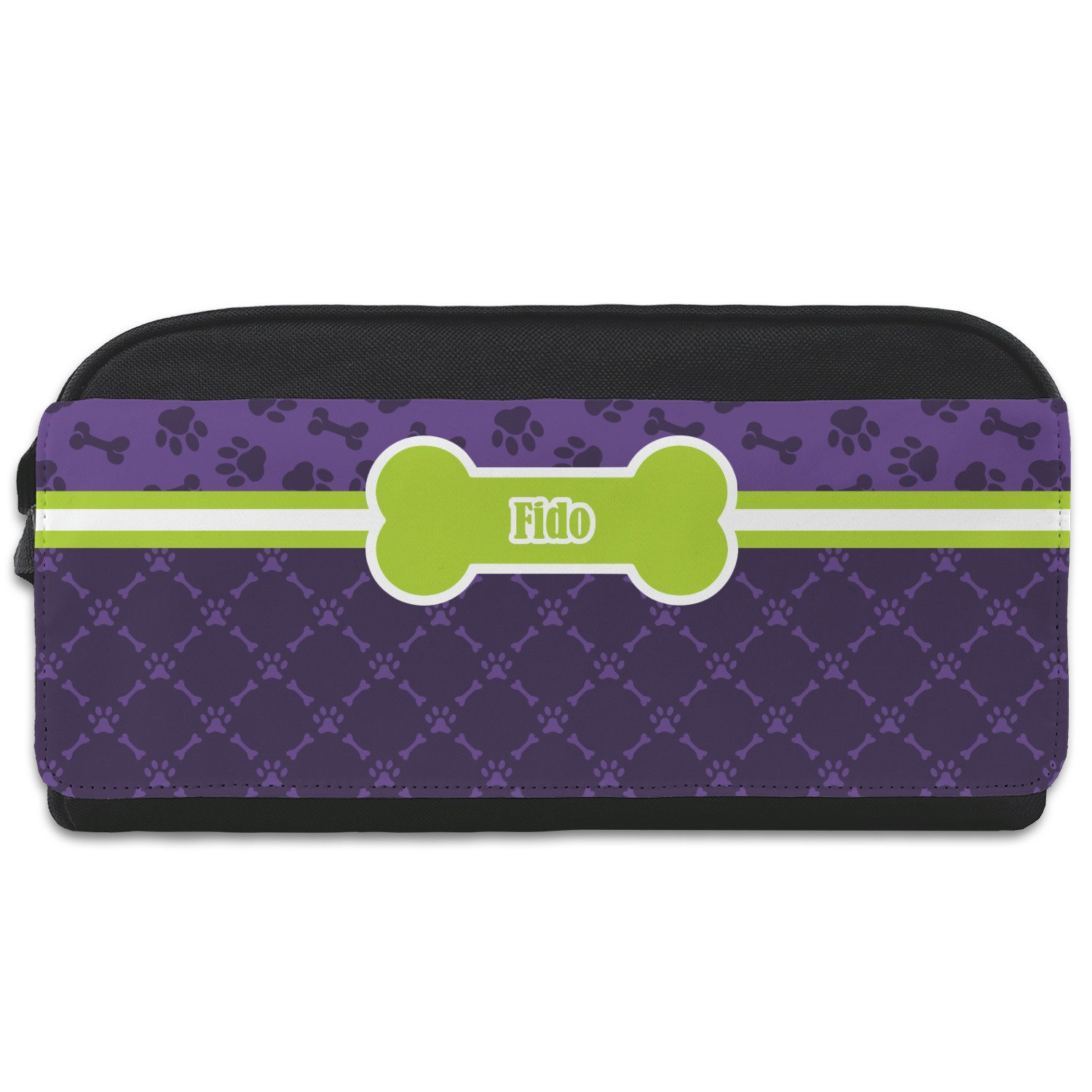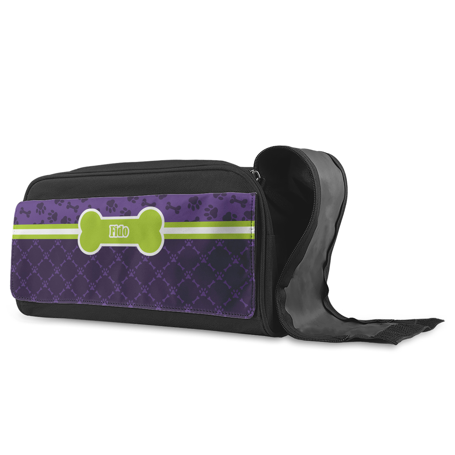 This design is a dark purple with light purple accents. It is divided into two different patterns that have bones and pawprints on them arranged in different ways. The dividing line, which is closer to the top, is made of a lime green and white ribbon. A label in the shape of a bone is on top with your pet's name right in the middle. The coordinating design has a fun sillhouette of a dog.