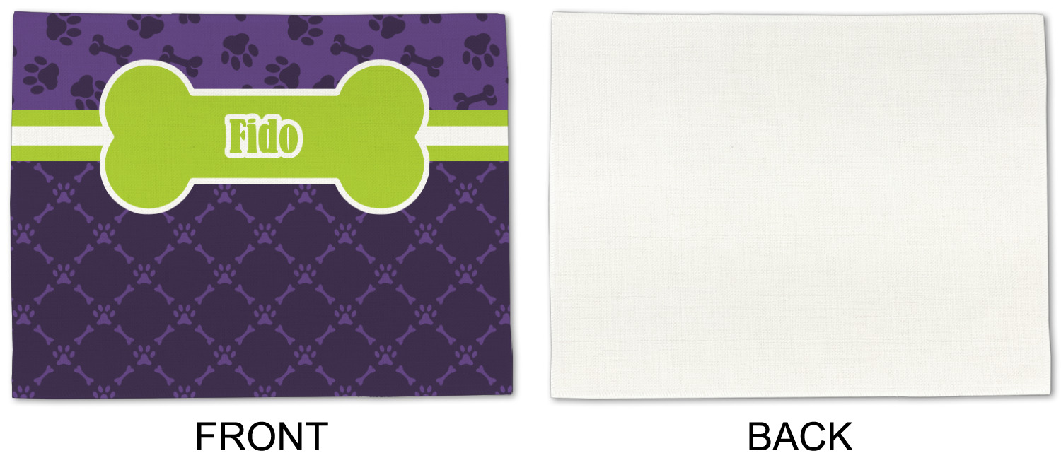 This design is a dark purple with light purple accents. It is divided into two different patterns that have bones and pawprints on them arranged in different ways. The dividing line, which is closer to the top, is made of a lime green and white ribbon. A label in the shape of a bone is on top with your pet's name right in the middle. The coordinating design has a fun sillhouette of a dog.