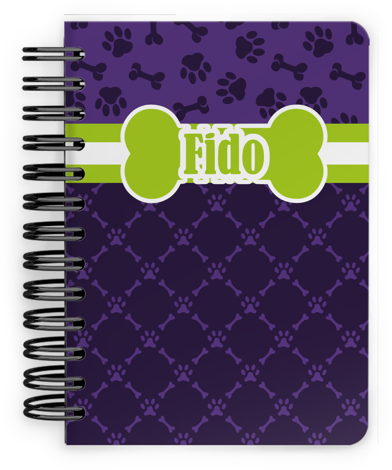 This spiral notebook includes 75 sheets of thick, ruled paper. The front and back of this custom notebook is made of a robust, laminate, plastic covering. We print your personalization on these two panels, underneath a glossy finish, which emphasizes the colors of your design. The two panels and the sheets of paper are held together by a sturdy, black coil. The paper within your bound notebook is perforated for easy, clean tearing.