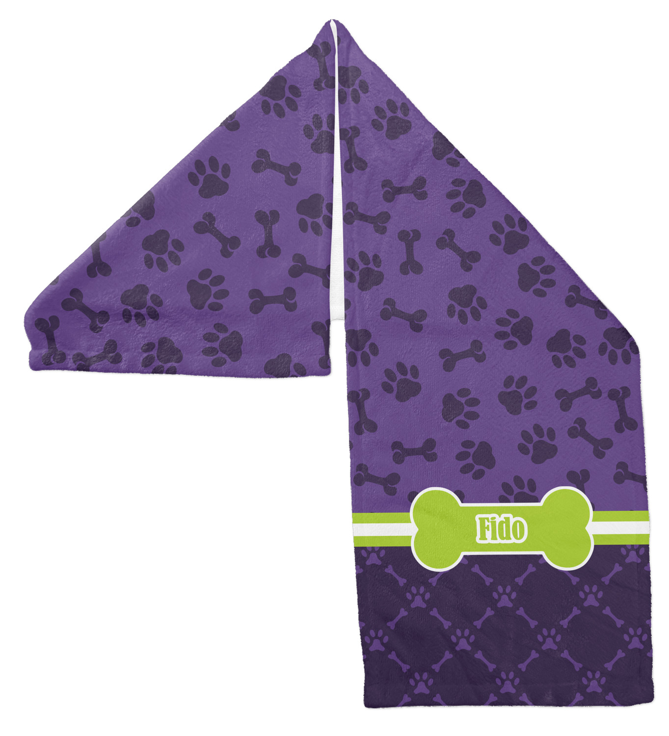 This design is a dark purple with light purple accents. It is divided into two different patterns that have bones and pawprints on them arranged in different ways. The dividing line, which is closer to the top, is made of a lime green and white ribbon. A label in the shape of a bone is on top with your pet's name right in the middle. The coordinating design has a fun sillhouette of a dog.