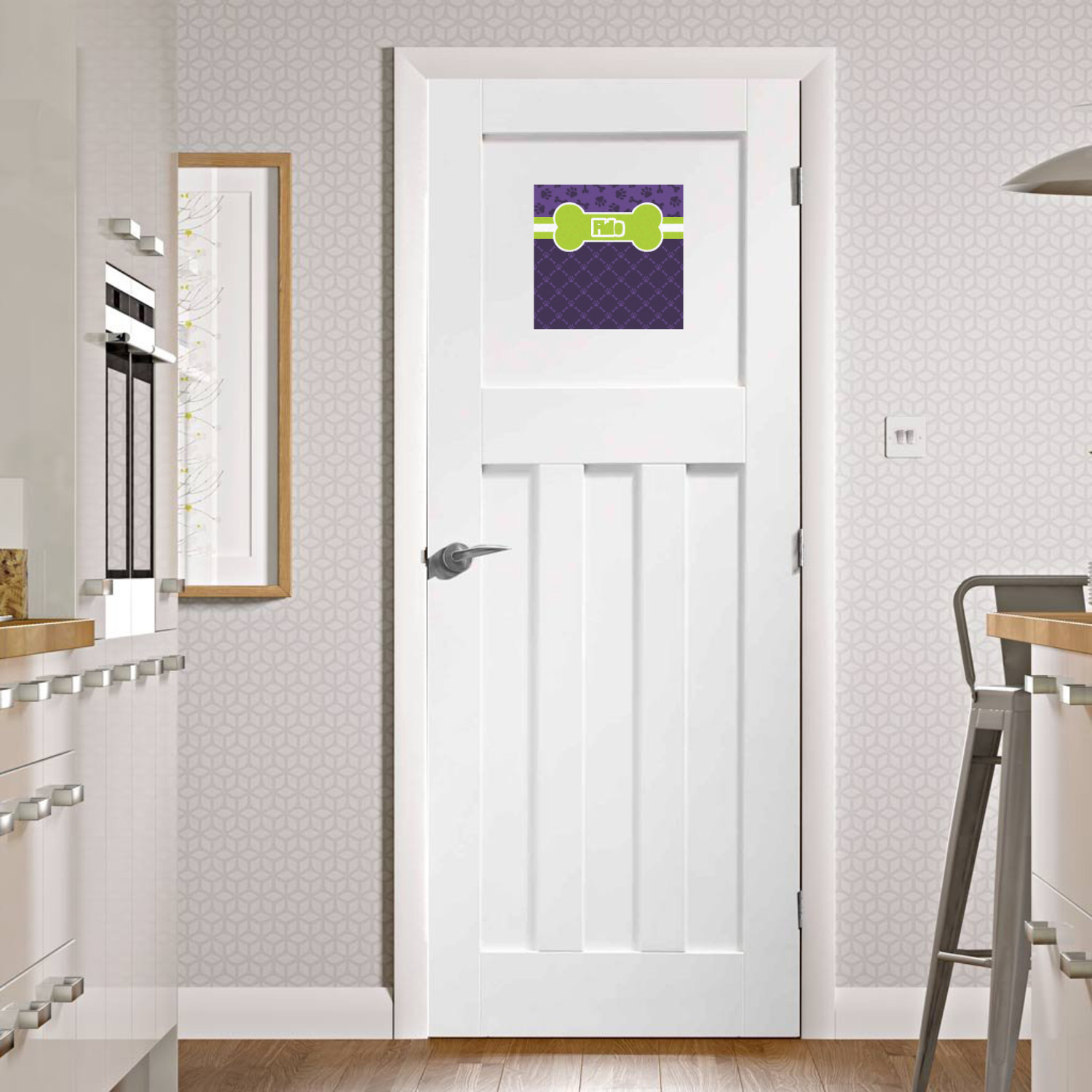 This design is a dark purple with light purple accents. It is divided into two different patterns that have bones and pawprints on them arranged in different ways. The dividing line, which is closer to the top, is made of a lime green and white ribbon. A label in the shape of a bone is on top with your pet's name right in the middle. The coordinating design has a fun sillhouette of a dog.