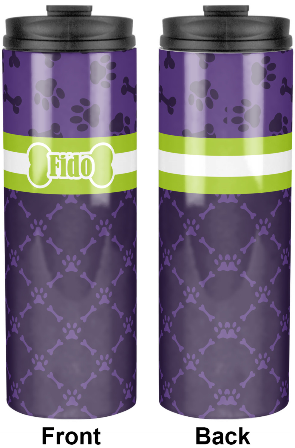 This design is a dark purple with light purple accents. It is divided into two different patterns that have bones and pawprints on them arranged in different ways. The dividing line, which is closer to the top, is made of a lime green and white ribbon. A label in the shape of a bone is on top with your pet's name right in the middle. The coordinating design has a fun sillhouette of a dog.