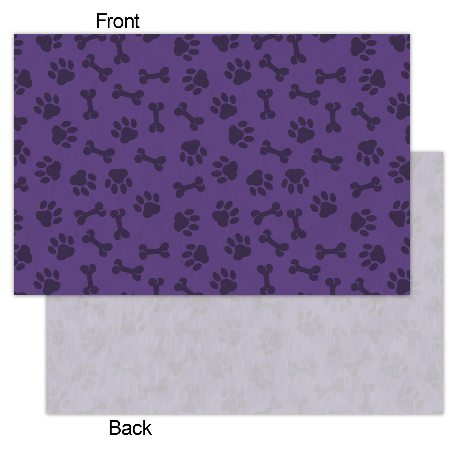 This design is a dark purple with light purple accents. It is divided into two different patterns that have bones and pawprints on them arranged in different ways. The dividing line, which is closer to the top, is made of a lime green and white ribbon. A label in the shape of a bone is on top with your pet's name right in the middle. The coordinating design has a fun sillhouette of a dog.