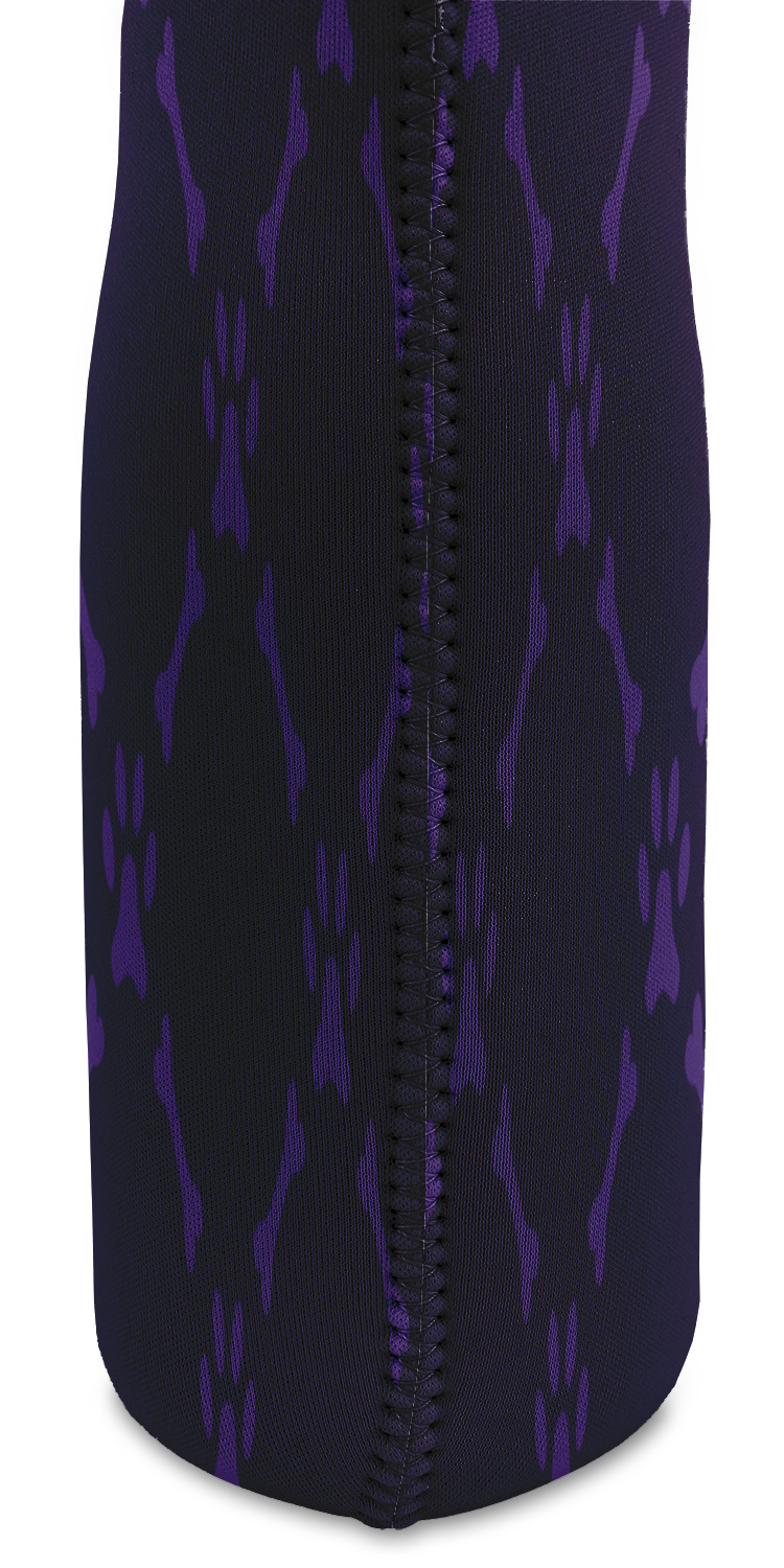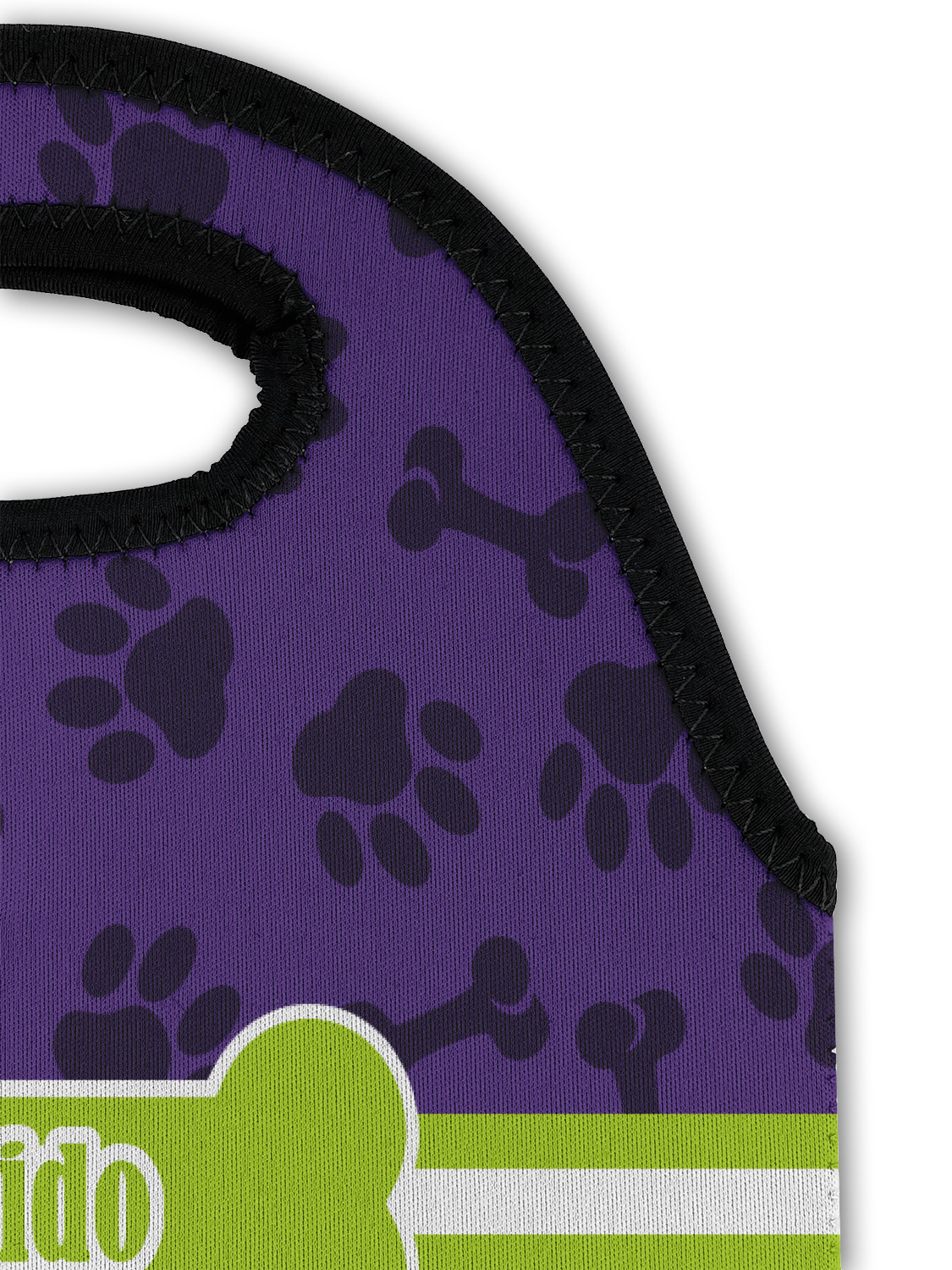 This design is a dark purple with light purple accents. It is divided into two different patterns that have bones and pawprints on them arranged in different ways. The dividing line, which is closer to the top, is made of a lime green and white ribbon. A label in the shape of a bone is on top with your pet's name right in the middle. The coordinating design has a fun sillhouette of a dog.