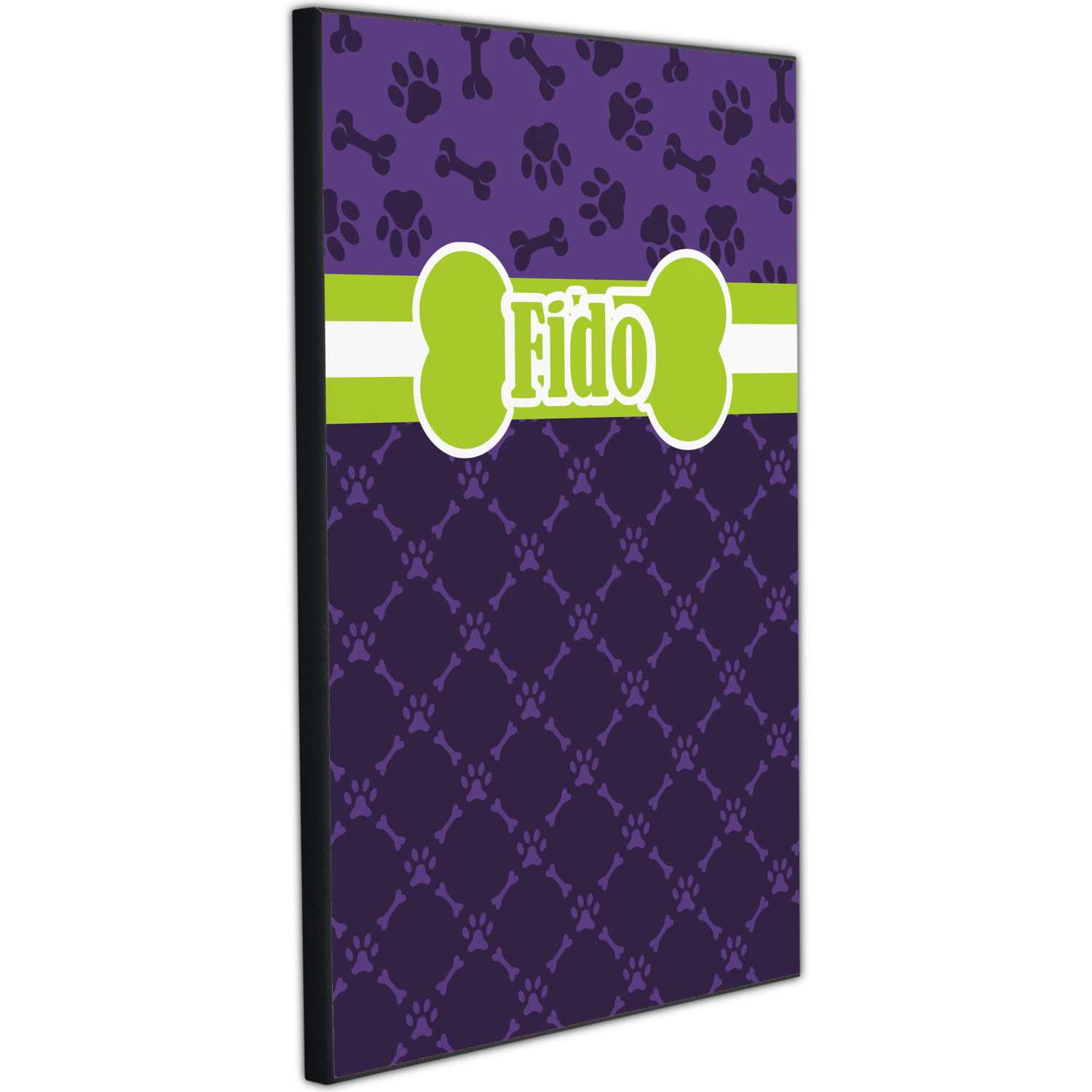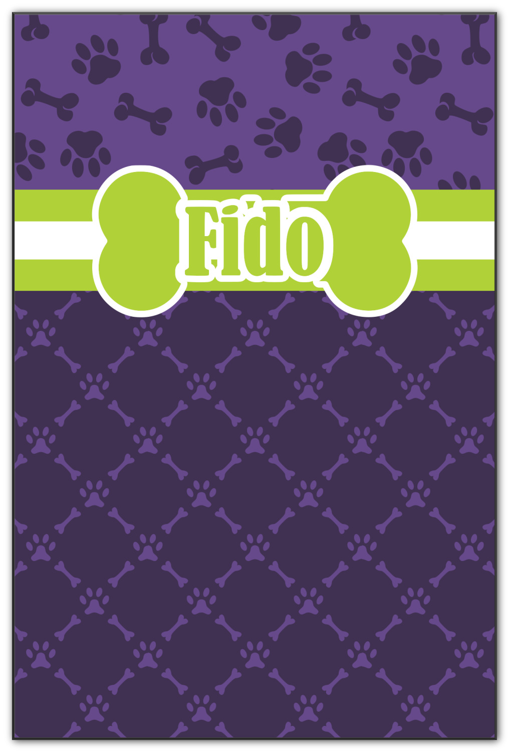 This design is a dark purple with light purple accents. It is divided into two different patterns that have bones and pawprints on them arranged in different ways. The dividing line, which is closer to the top, is made of a lime green and white ribbon. A label in the shape of a bone is on top with your pet's name right in the middle. The coordinating design has a fun sillhouette of a dog.