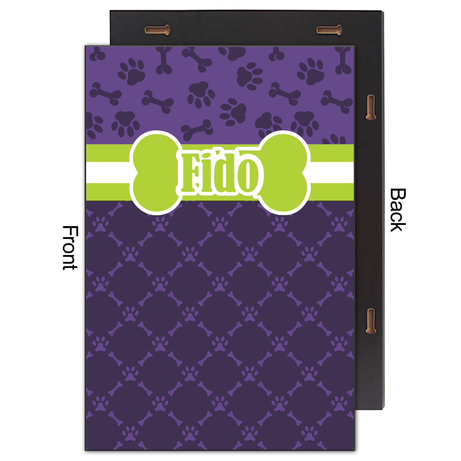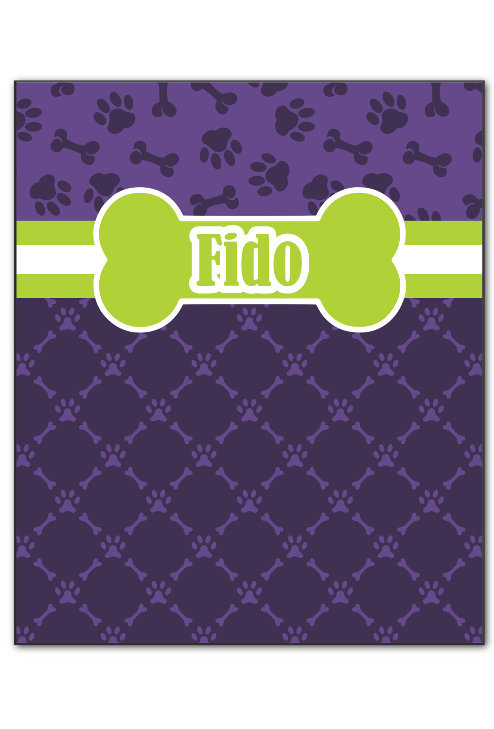 This design is a dark purple with light purple accents. It is divided into two different patterns that have bones and pawprints on them arranged in different ways. The dividing line, which is closer to the top, is made of a lime green and white ribbon. A label in the shape of a bone is on top with your pet's name right in the middle. The coordinating design has a fun sillhouette of a dog.