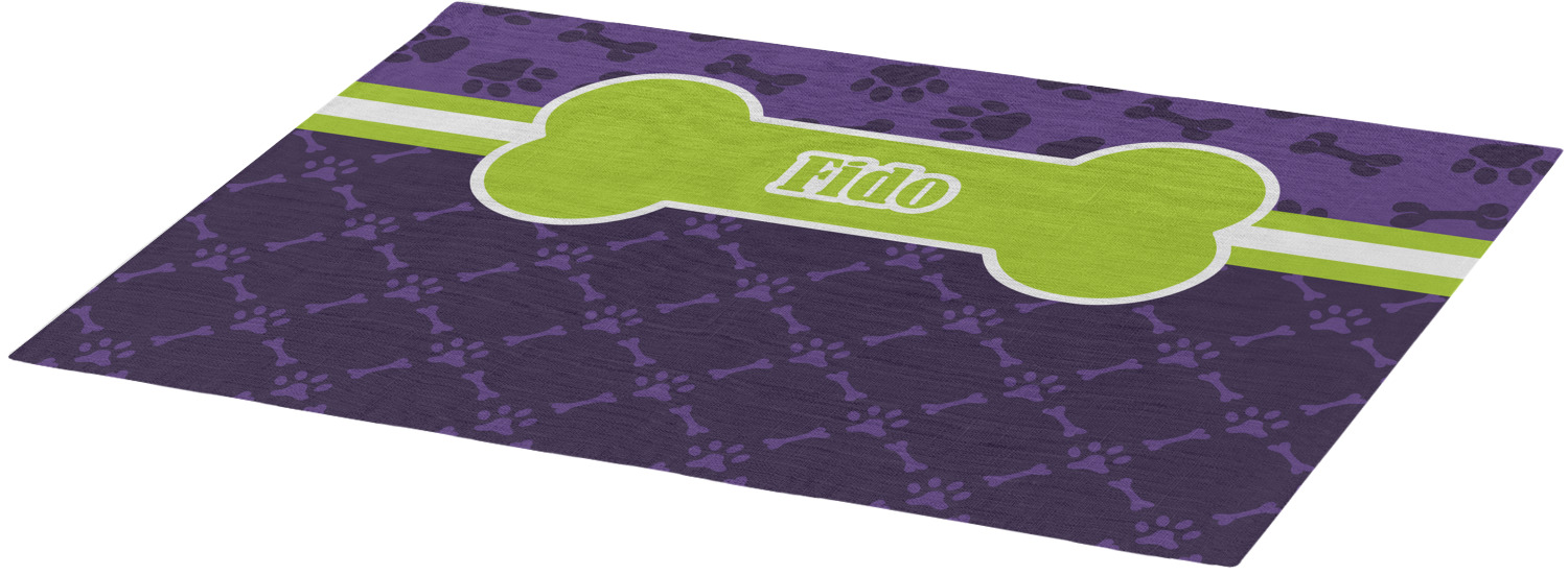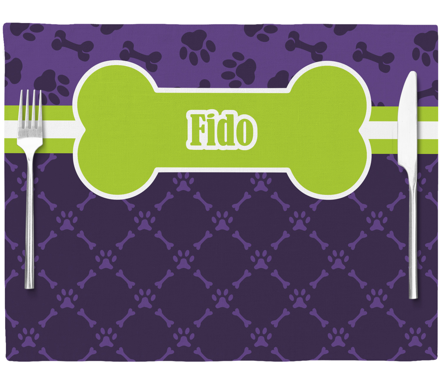 This design is a dark purple with light purple accents. It is divided into two different patterns that have bones and pawprints on them arranged in different ways. The dividing line, which is closer to the top, is made of a lime green and white ribbon. A label in the shape of a bone is on top with your pet's name right in the middle. The coordinating design has a fun sillhouette of a dog.