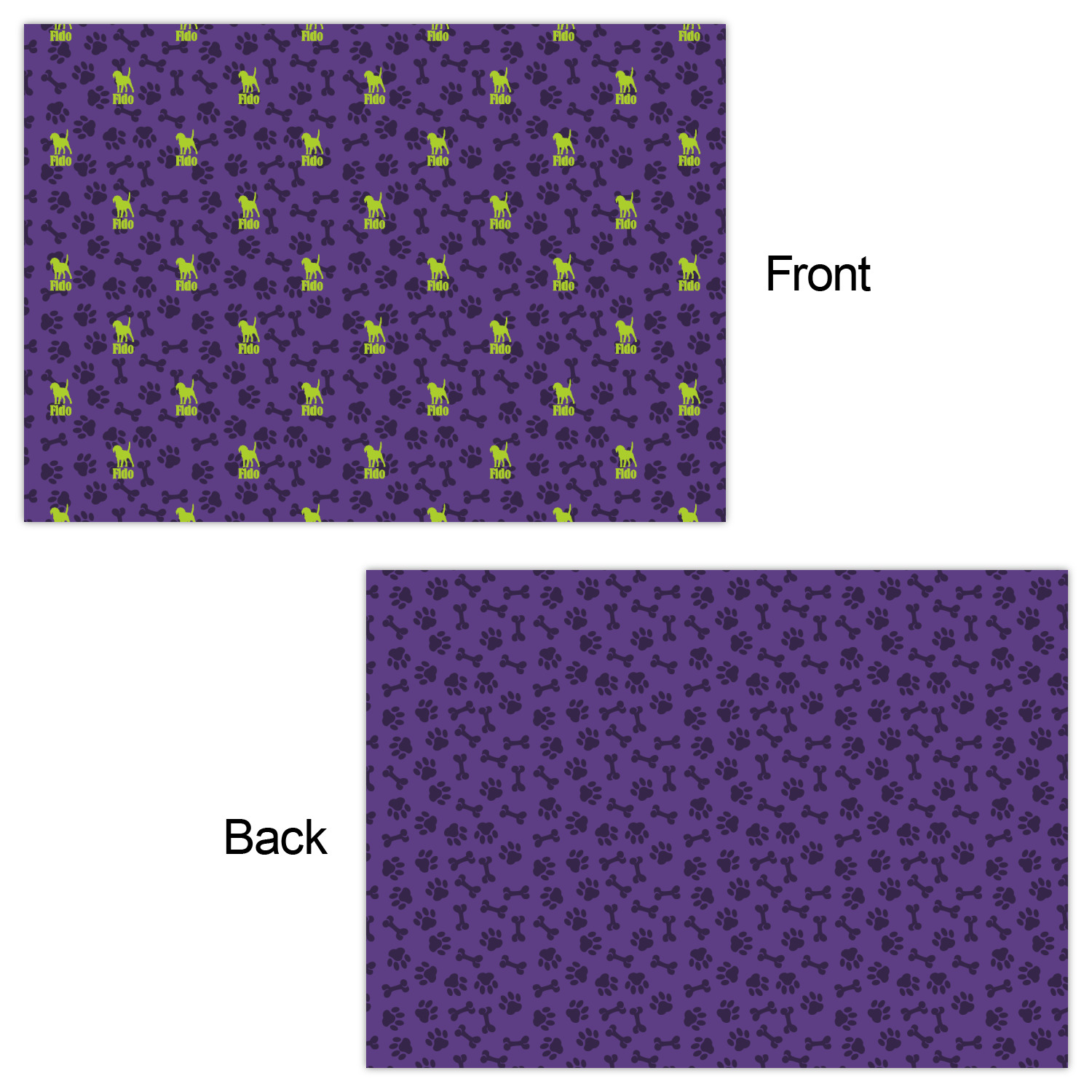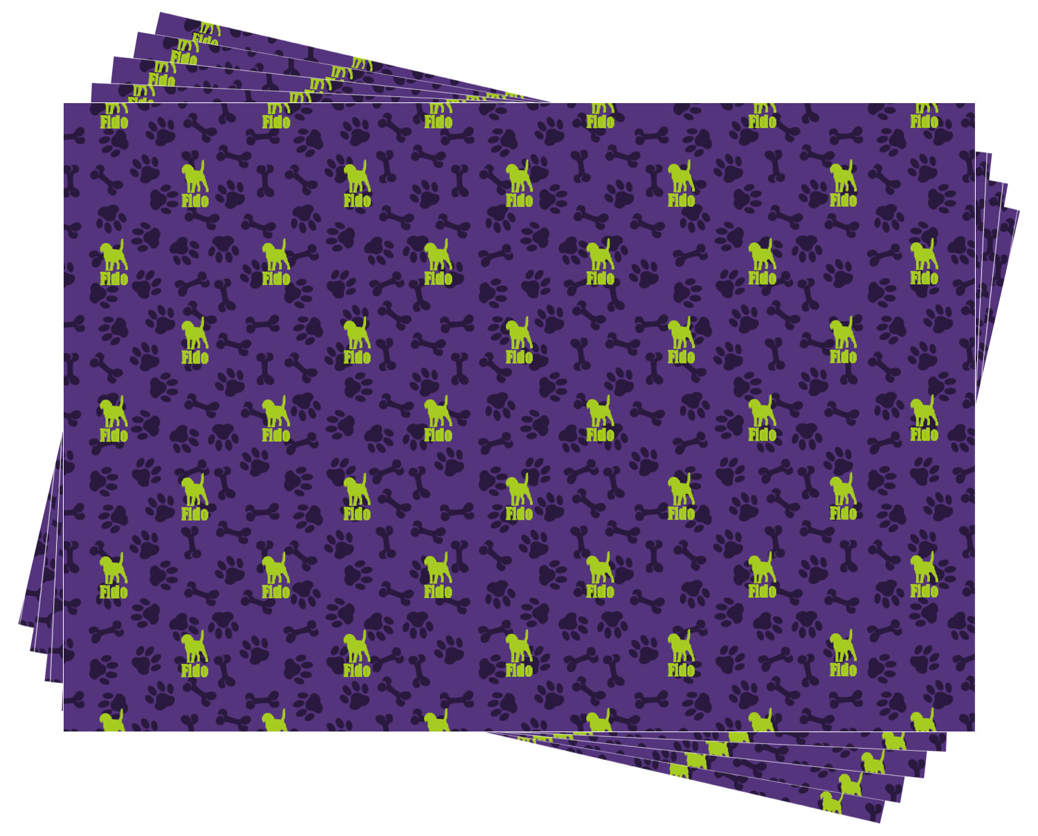 This design is a dark purple with light purple accents. It is divided into two different patterns that have bones and pawprints on them arranged in different ways. The dividing line, which is closer to the top, is made of a lime green and white ribbon. A label in the shape of a bone is on top with your pet's name right in the middle. The coordinating design has a fun sillhouette of a dog.