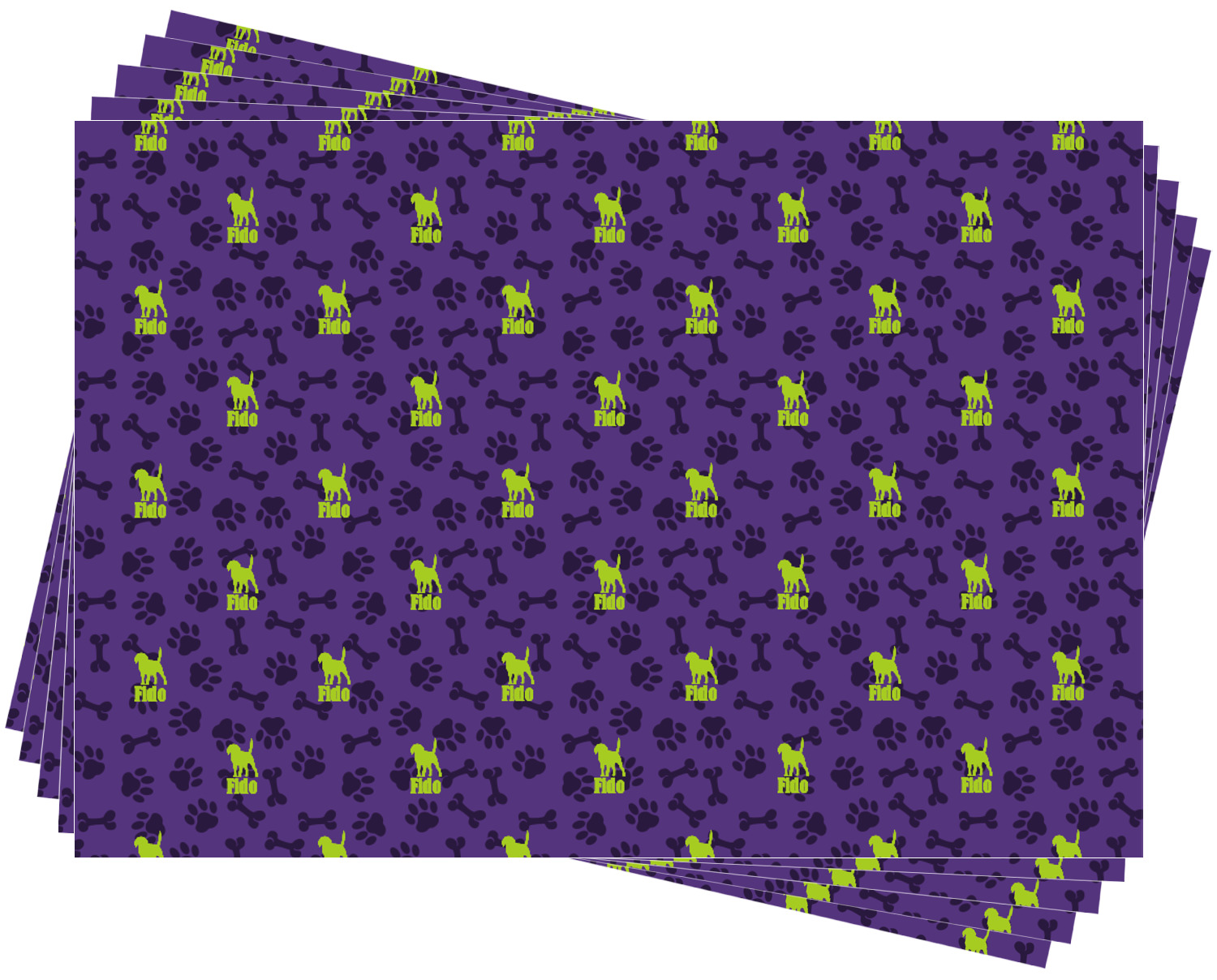 This design is a dark purple with light purple accents. It is divided into two different patterns that have bones and pawprints on them arranged in different ways. The dividing line, which is closer to the top, is made of a lime green and white ribbon. A label in the shape of a bone is on top with your pet's name right in the middle. The coordinating design has a fun sillhouette of a dog.