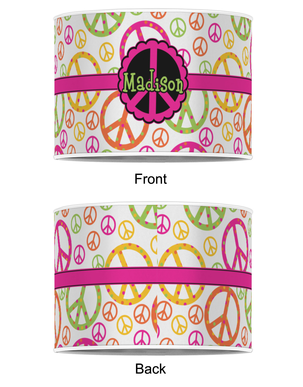 This design is totally groovy and will let the little hippie chick in you shine. Our peace sign design is simply adorable and has beautiful vibrant colors of pink, orange, lime green and yellow. The larger peace signs have fun polka dots and are surrounded by smaller solid colored peace signs.
