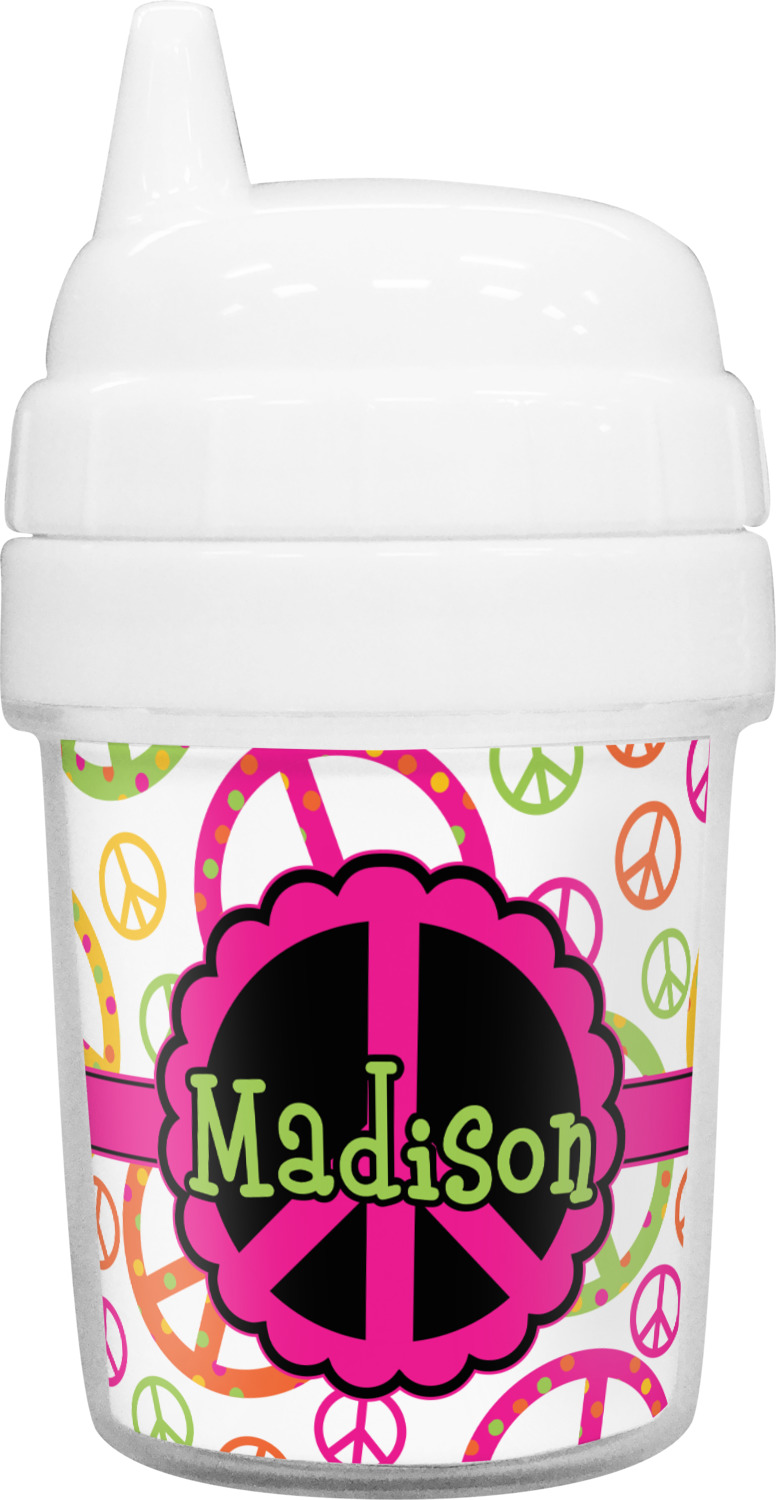 Our toddler cups are free of BPA, and have a twist-open lid so that you can easily fill and clean these cups for your young ones. Each cup also comes with a sippy nozzle to reduce spills. We offer these custom sippy cups in two different sizes; we have a baby sippy cup that holds 5 ounces, and a toddler sippy cup that holds 10 ounces. Your customization is printed on a premium glossy media insert that is placed within these toddler drinking cups.
