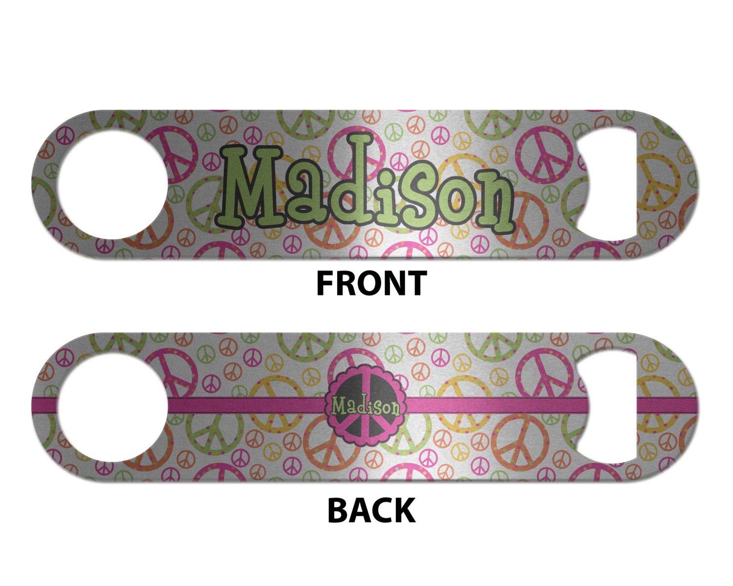 Made from stainless steel, these beer bottle openers are 7 by 1.625 inches, giving you plenty of leverage when trying to open a stubborn bottle. On one end of this personalized bottle opener, you'll find a circular hole for you to hang and display your opener. On the opposite end, you'll find the tool used for opening bottles. This opener in particular has the same structure and style as professional bartender bottle openers. Your customization is sublimated onto both the back and front, and both sides can be customized individually. Choose from one of our two base colors - white or silver.