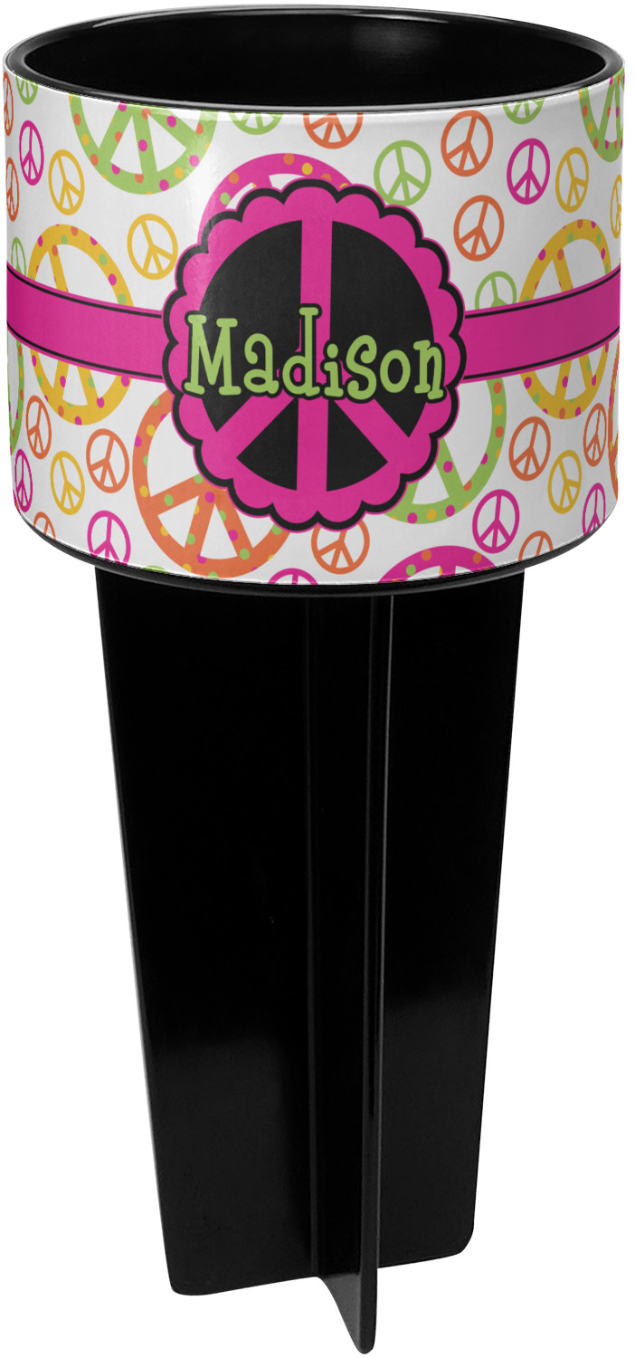 This cup holder has a large stake at its bottom that anchors it to the sand or ground below, while the cup holder rests above the stake. The entire drink holder is made of durable plastic and displays your customization around the cup holder portion. We sell these personalized beach spikers in two different colors: black and white.