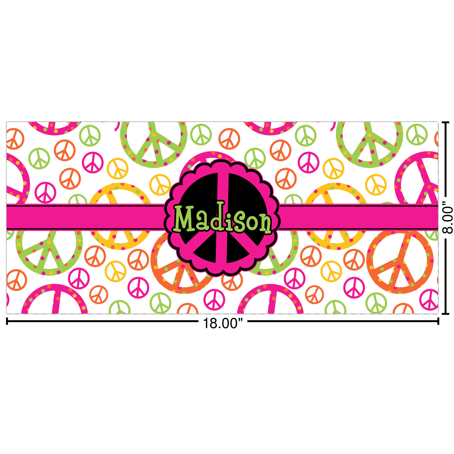 This design is totally groovy and will let the little hippie chick in you shine. Our peace sign design is simply adorable and has beautiful vibrant colors of pink, orange, lime green and yellow. The larger peace signs have fun polka dots and are surrounded by smaller solid colored peace signs.