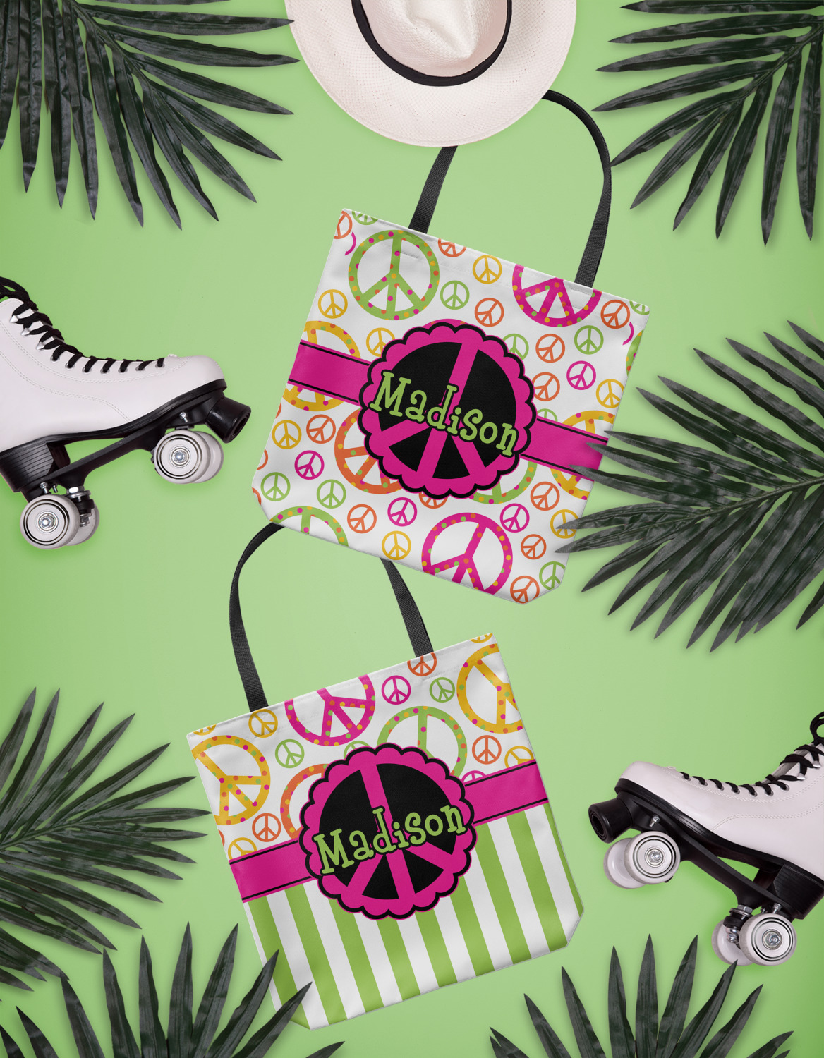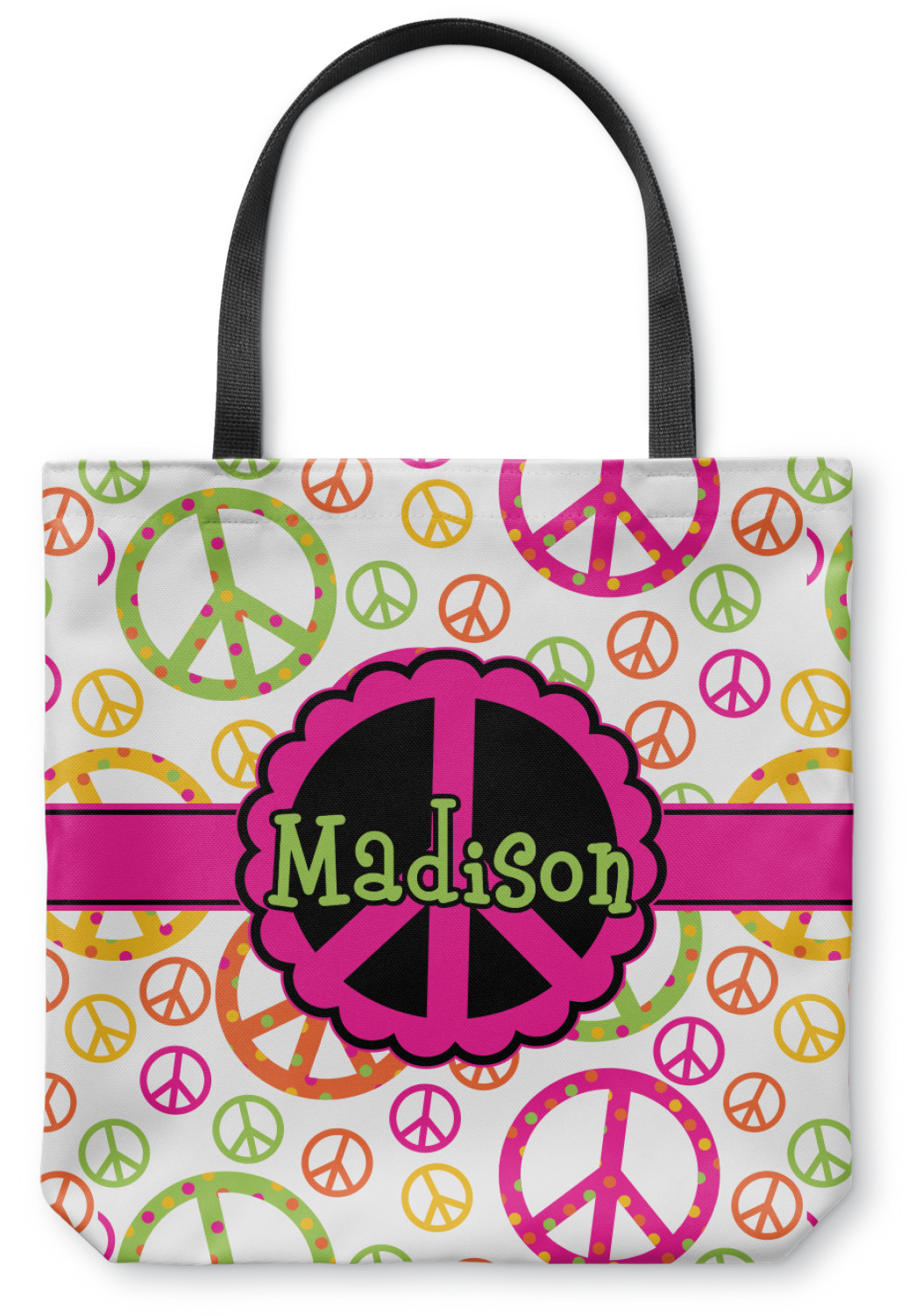 This design is totally groovy and will let the little hippie chick in you shine. Our peace sign design is simply adorable and has beautiful vibrant colors of pink, orange, lime green and yellow. The larger peace signs have fun polka dots and are surrounded by smaller solid colored peace signs.